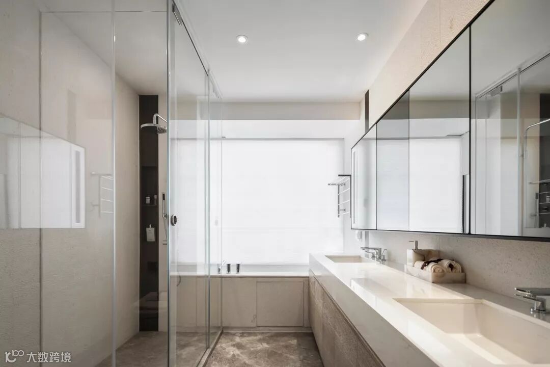 各个功能区运用大面积透明的玻璃合理的划分开来,洗漱台大分块的设计、柜体小分块的分割,满足了基本的生活需求又丰富了空间的艺术形态。