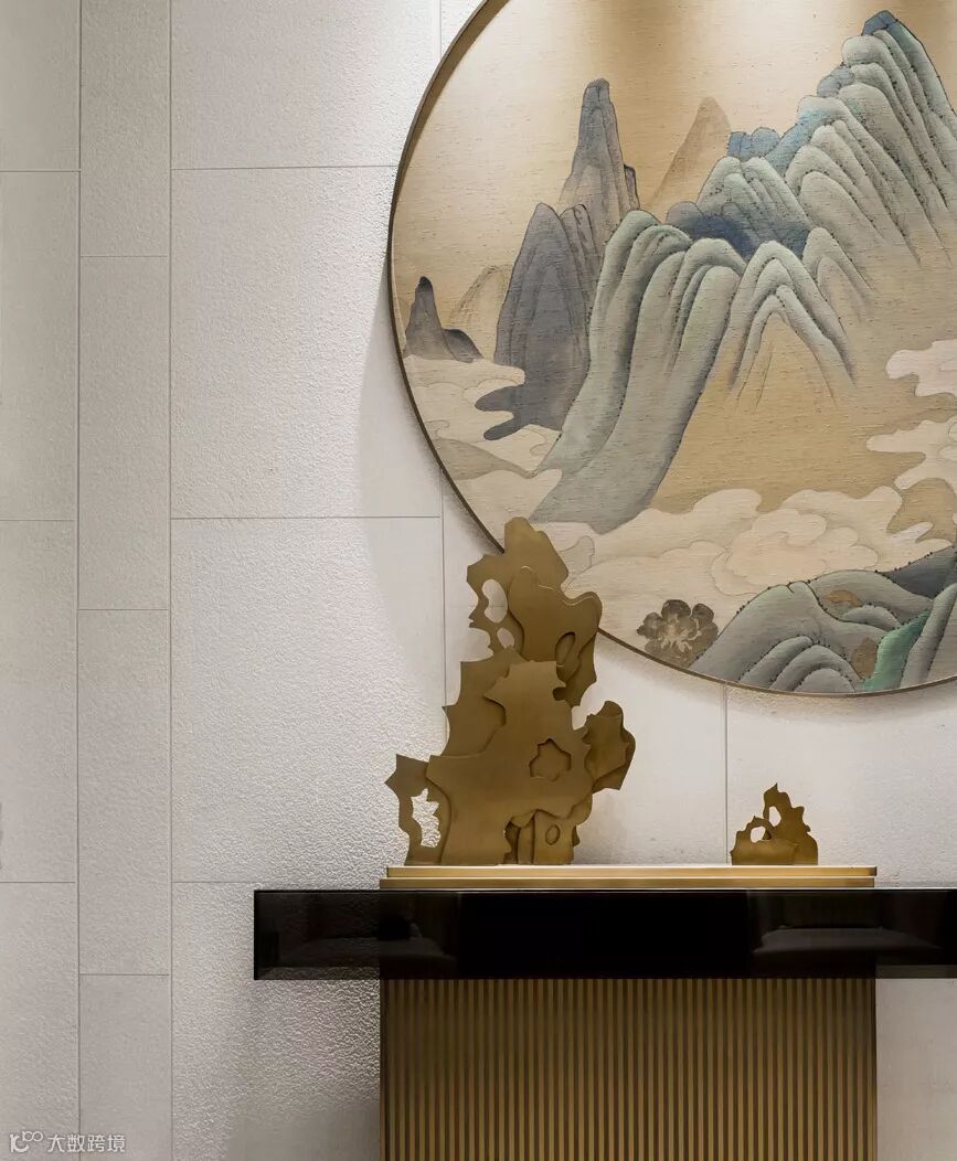 映入眼帘的是一幅清新淡雅的水墨山水画,搭配以天然原木质地的方桌,入户即感受到一种层次之美。