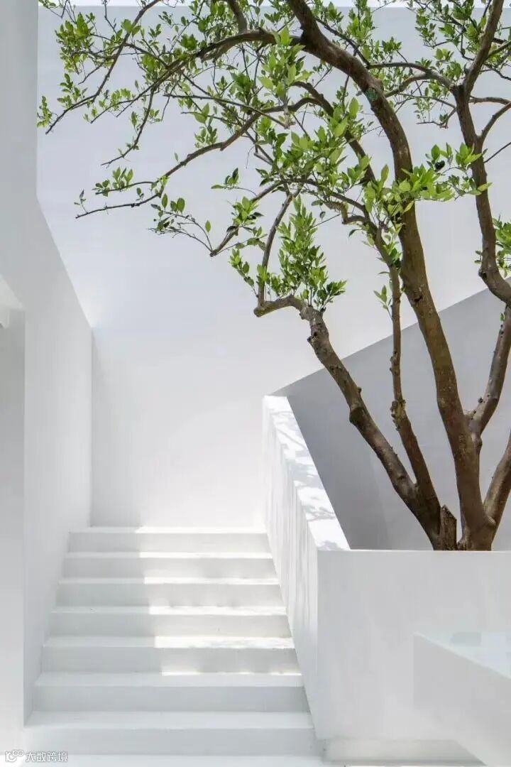 工作室门口是一道曲折的楼梯。素净的白墙,禅意十足的树木,弱化建筑的线条感,为平淡的白增添了几分活力。
