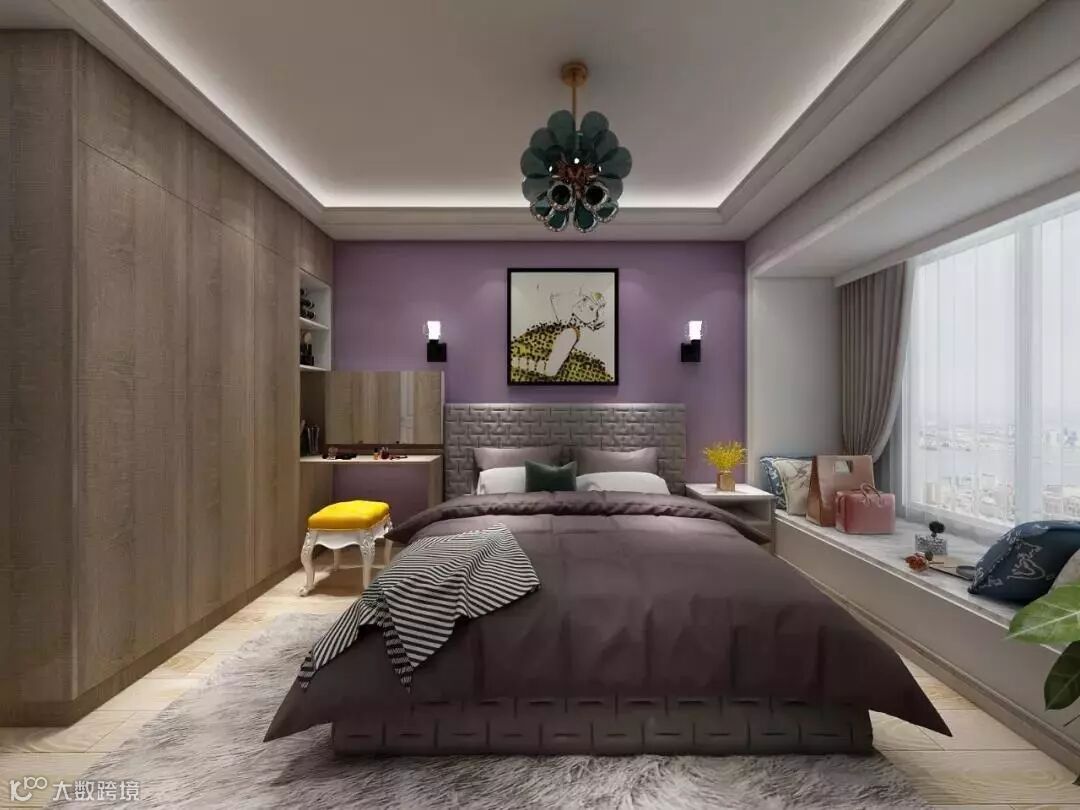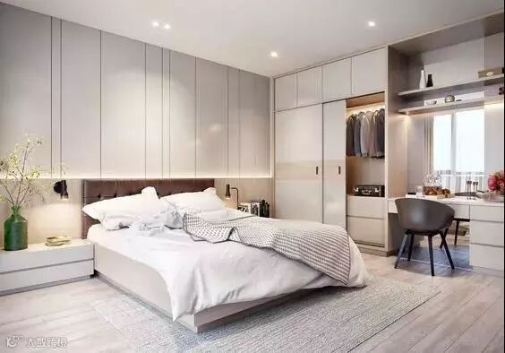 独木不成林,单一衣柜往往显得突兀,对于空间较为宽敞的卧室,可以考虑通过与吊柜、储物柜、飘窗柜系统组合,打造出多功能的床头一体化收纳系统。