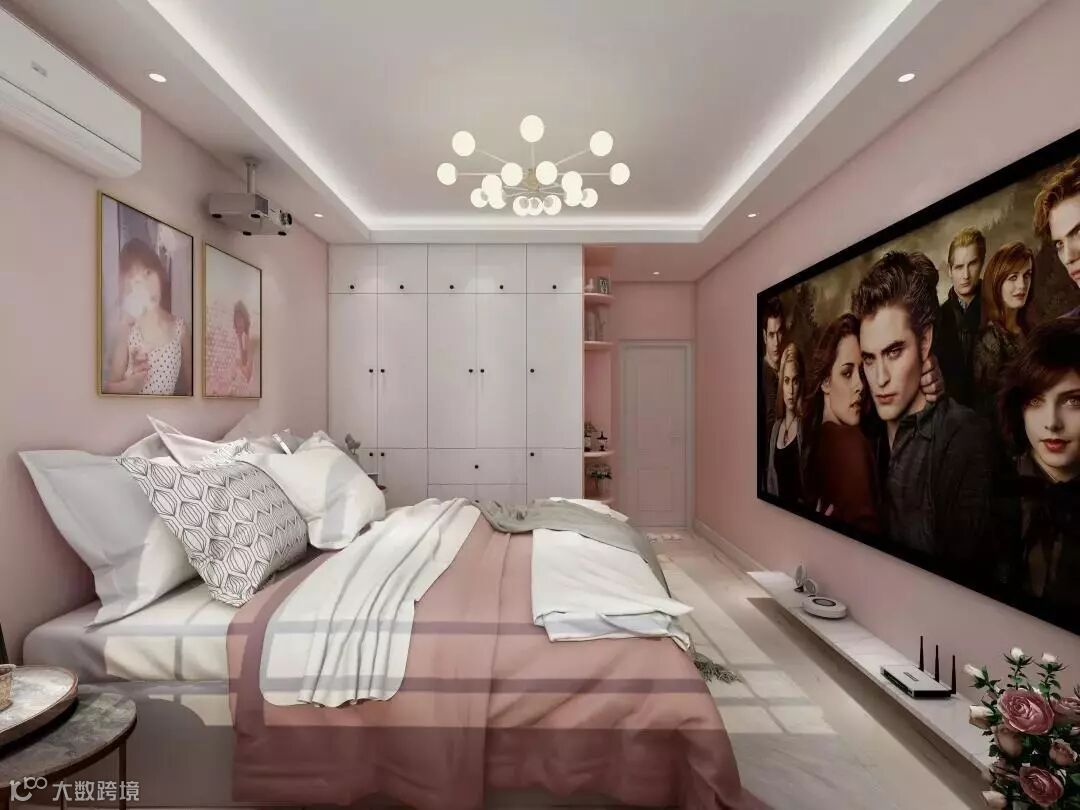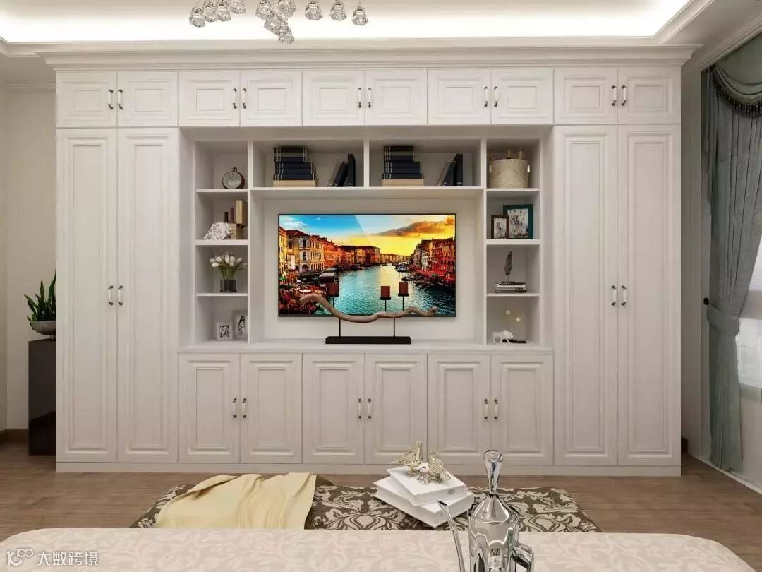 这是现在很流行的一种衣柜设计理念:将衣柜填满整面墙体,单单留出中部的位置来安装电视。既满足了在卧室看电视的温馨需求,又不占用多余的空间,一举两得。