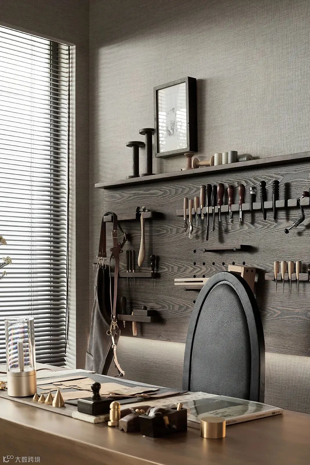 安放思绪的书房是挖掘生活内核的绝佳之处。皮艺工具规整且自由的静置于展示架上,逐渐累积珍藏温润的记忆和情感。