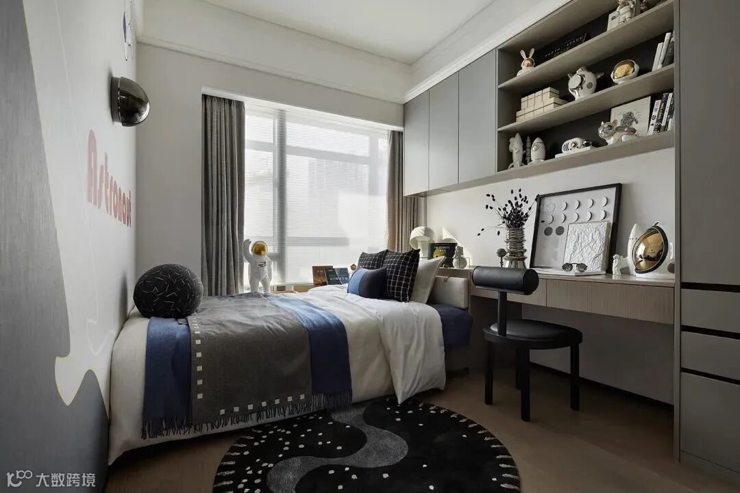 在男孩房中,蓝灰色是主调,极具艺术及想象空间的背景墙,太空墙纸与挂画也有所呼应,每个小细节构成别样和谐有趣的生动画面,为空间带来源源不断的生命力。