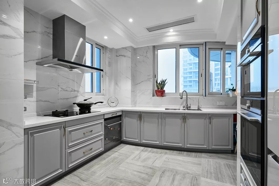 开放式厨房运用纯白的色彩元素将整个空间进行放大,不仅看上去干净整洁,还更易进行搭配,同时又不会显得过于张扬。
