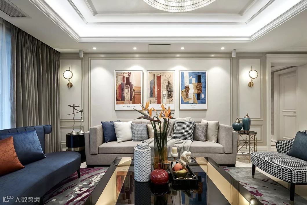 客厅的设计凸显浪漫情调,深蓝色色搭配米白色、灰色,素雅温馨,呈现的是一片简约、优雅和大气并存的轻松空间。