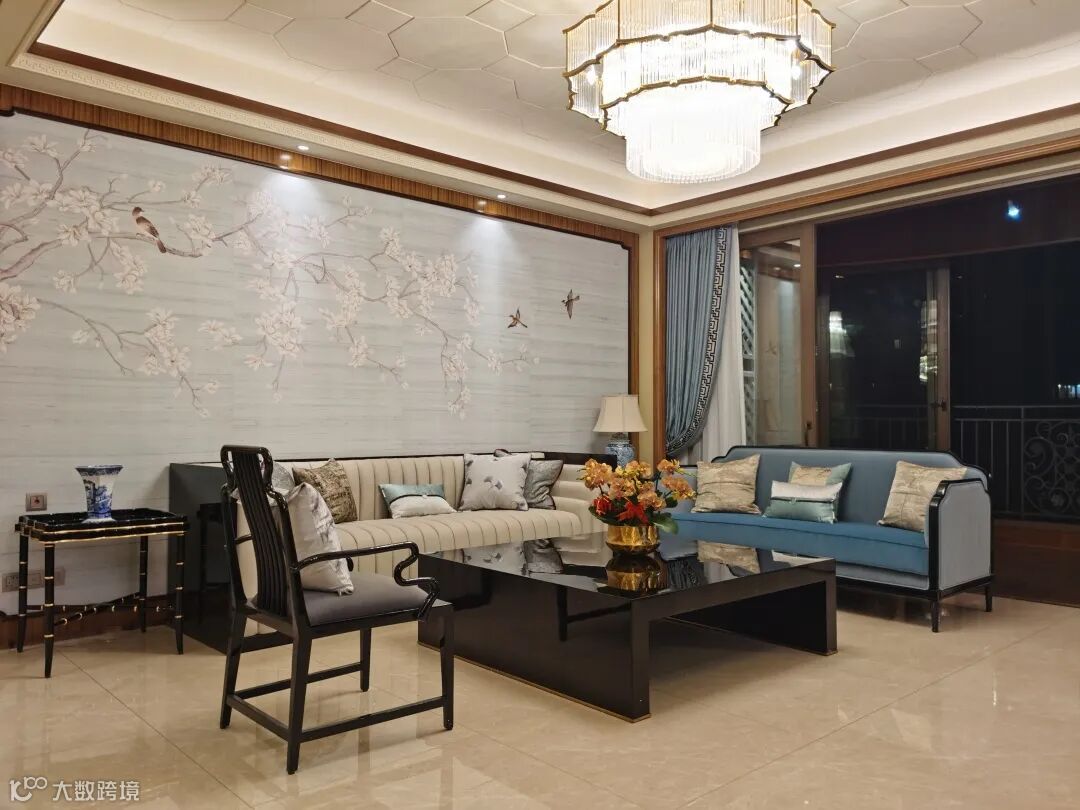 客厅以米色系为主色调,辅以蓝色、咖色进行调和,头顶是泛着金色光芒的流苏叠层吊灯,背景墙则以“梅花”作为空间的点睛及过渡,诠释中国传统文化的精粹,为生活注入纯粹、唯美、雅致,感知空间温度与确幸。
