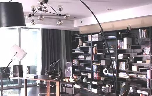 细节处理上也充分彰显个性。黑色的书柜几乎成了客厅的背景墙,极为简洁的线条,素净的台灯以及精致的沙漏装饰,简单又不失美观大方,安静严谨并且高雅细致。