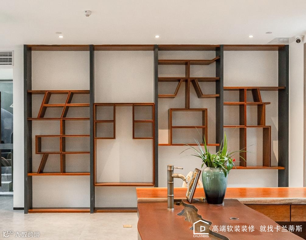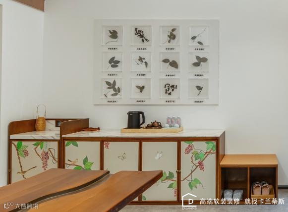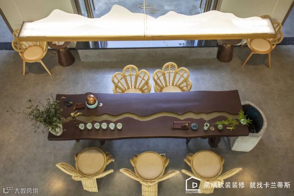 茶台:茶台中间的排水装置,灵感源于七溪地弯曲的溪流设计,对应七溪地的河流自然造型,高低起伏,生动形象。