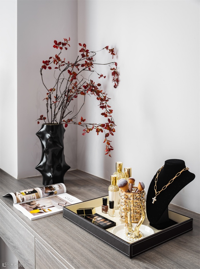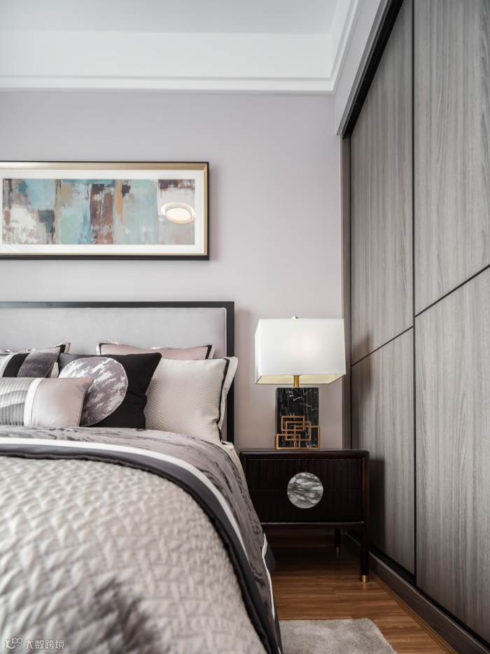 次卧整体风格以素雅清逸为主,色调和而不同,提升了整体空间的层次感。艺术装置画与深色线条搭配,简约却不简单。