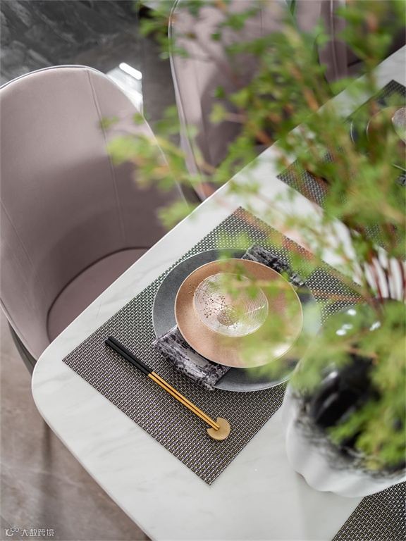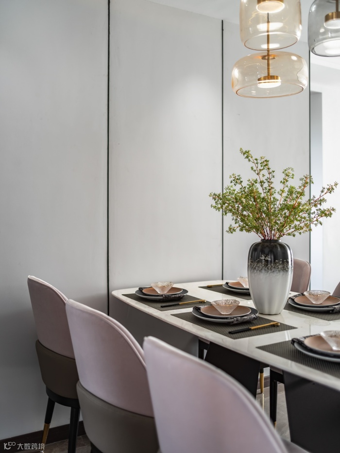 从厨房延续出来的餐厅舍弃了隔断,光线的流通使整个空间更显敞亮,绿植被古典陶瓷器盛放,宛如满天星般散开,淡雅从容中透出一抹诗情画意。