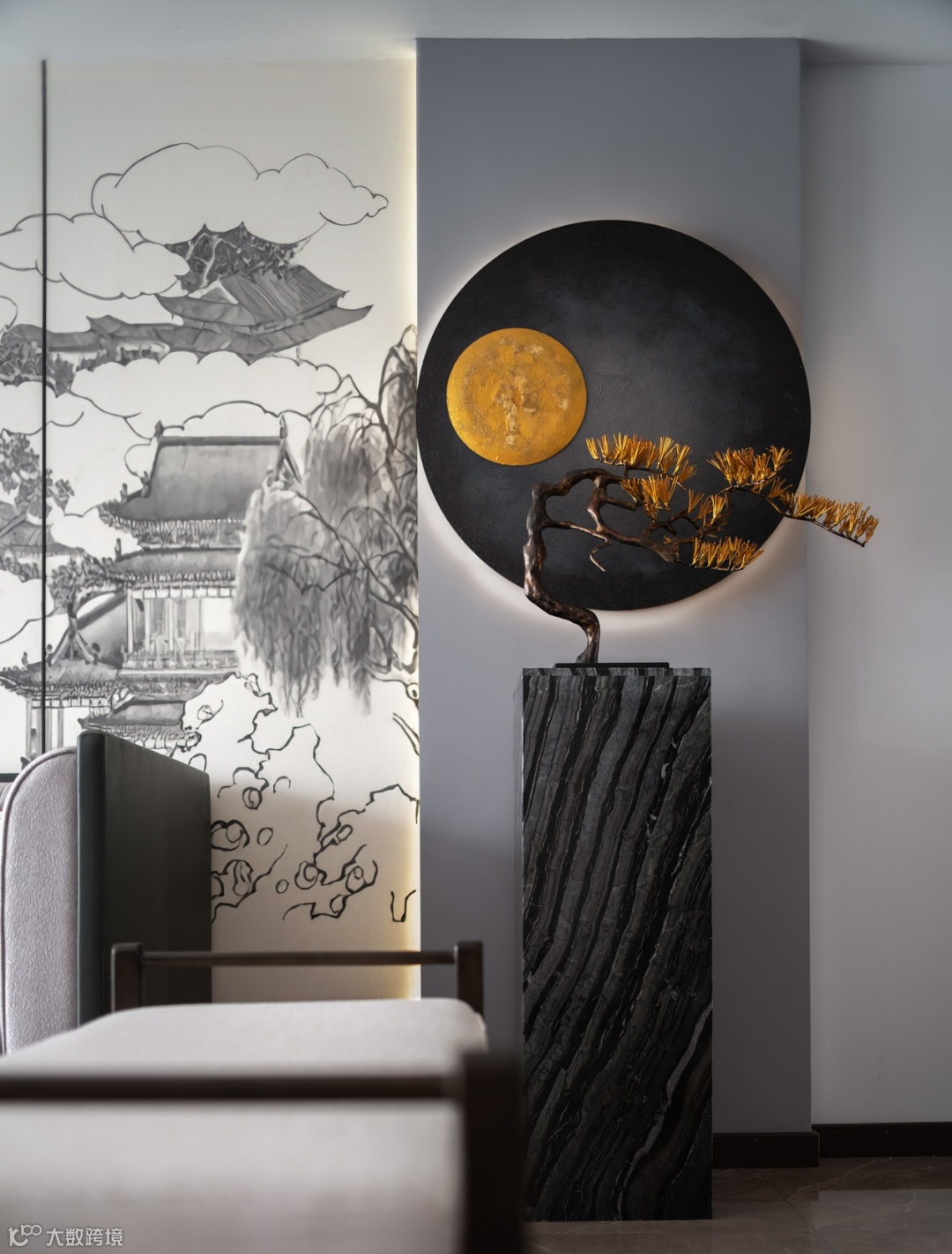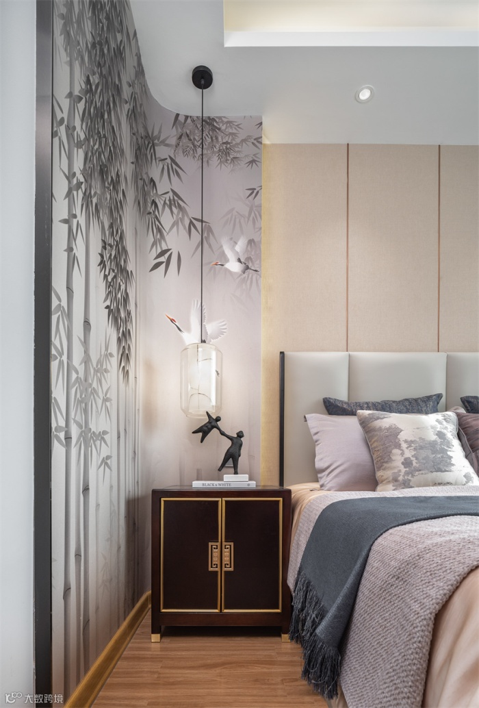 主卧多以浅色系为整体基调,给人以空濛雅致的氛围感以及舒适从容的归属感。竹里风声月上门,青山有思,白鹤忘机,如诗如画的背景墙仿佛置身仙境,与床面上摆放的云纹枕饰搭配,相得益彰。