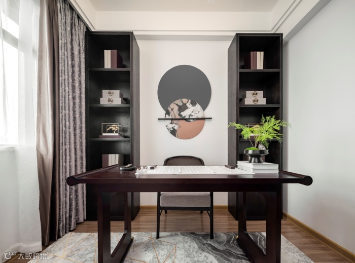 书房的整体空间从中往两边铺开,结构上呈现出新中式独特的对称美,给人以庄重大气、有条不紊的视觉享受。