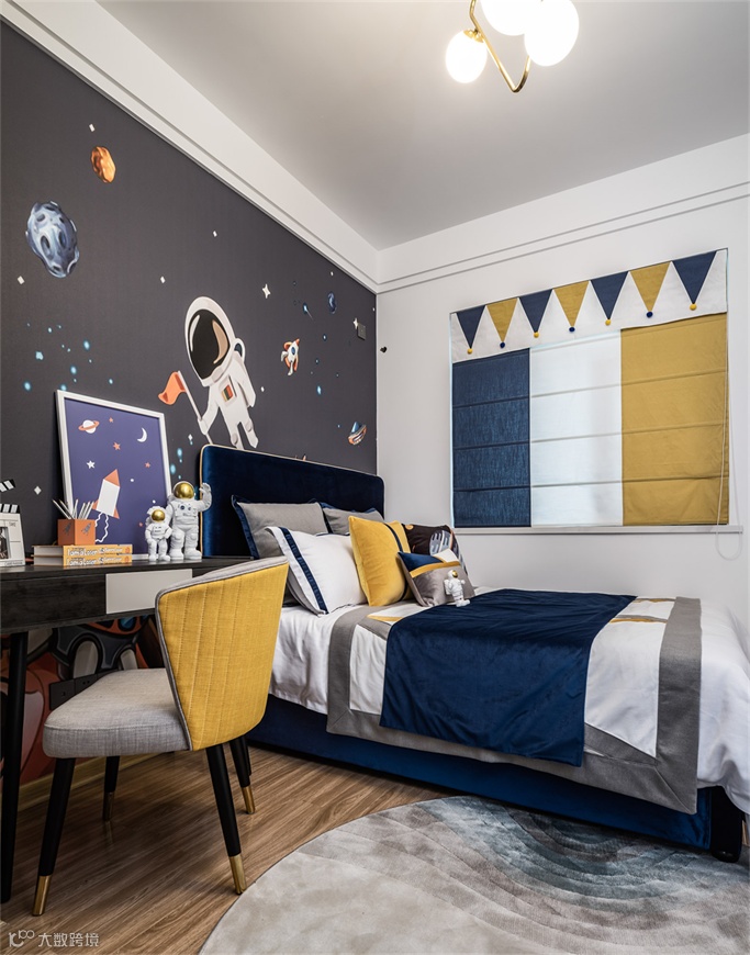 搭乘梦的飞船,于星空中遨游,以宇航员为主题儿童房采用高饱和的蓝白黄三色跳色,中和了深色背景墙带来的沉闷感,布艺窗帘去繁就简,融于墙壁自然活泼,童趣十足的摆件为空间增添了几分纯真生动。