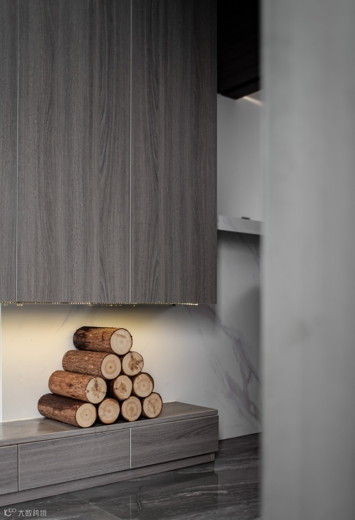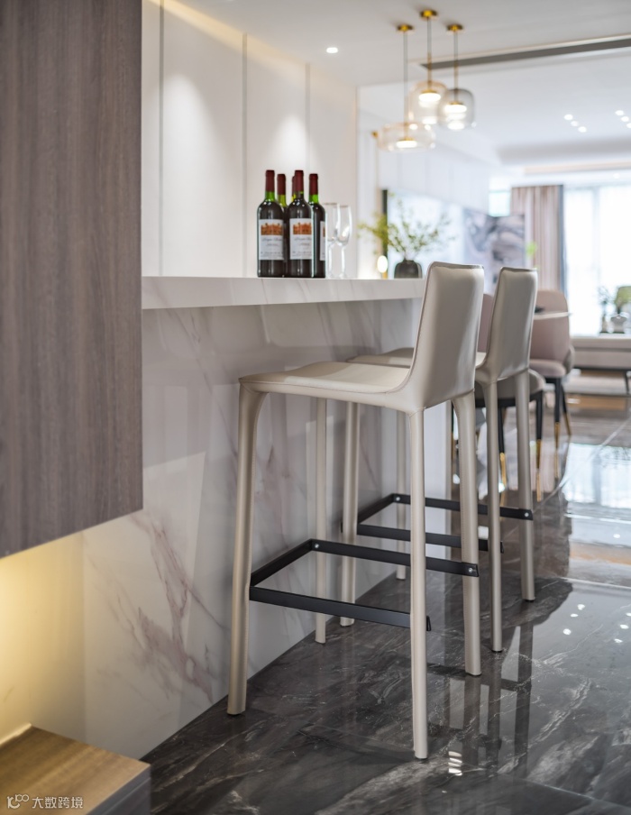 厨房巧妙利用空间,开放式设计与浅色系大理石吧台让整体空间更为通透宽敞,天花板与地面的深色系在空间上发挥出十足的层次感。