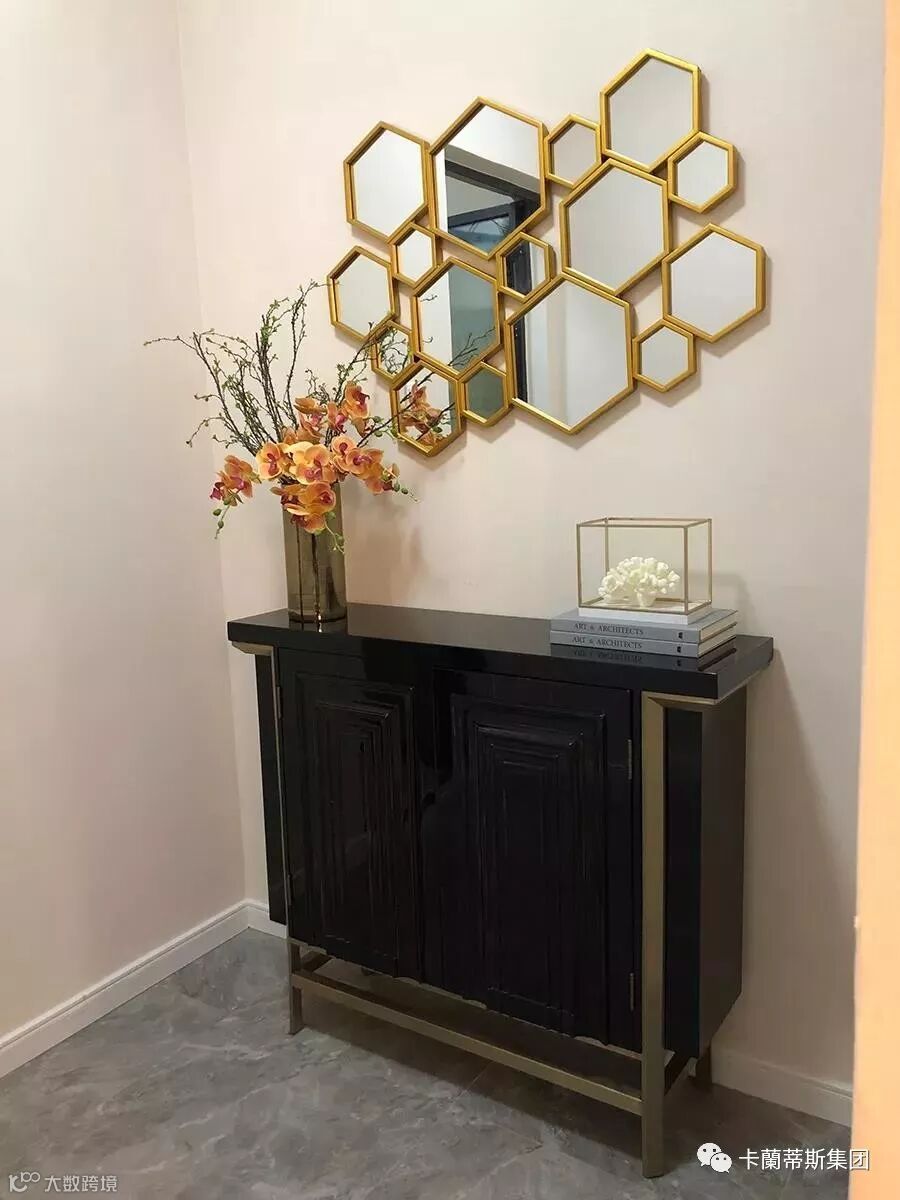 柜上的背景墙用镶金边的镜子做装饰,不仅实用,还能尽显低调的高级感。