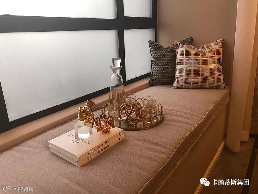 在卧室飘窗,在黑白灰的基础上,用精美的黄铜色茶具做装饰,给房主人打造了一个悠然喝茶、看书的慵懒之地。
