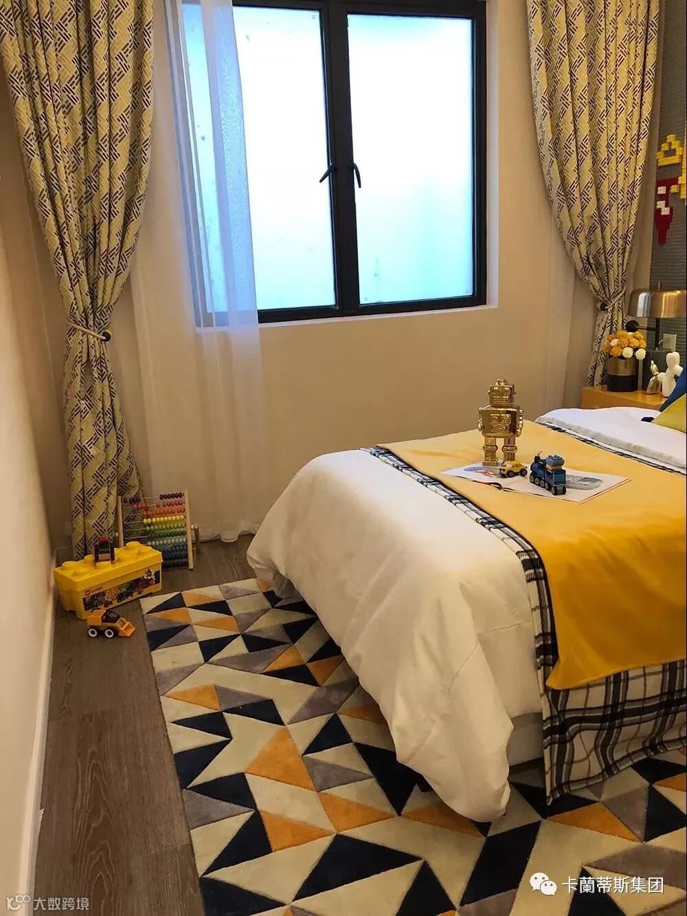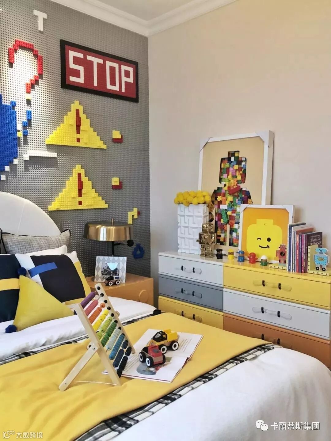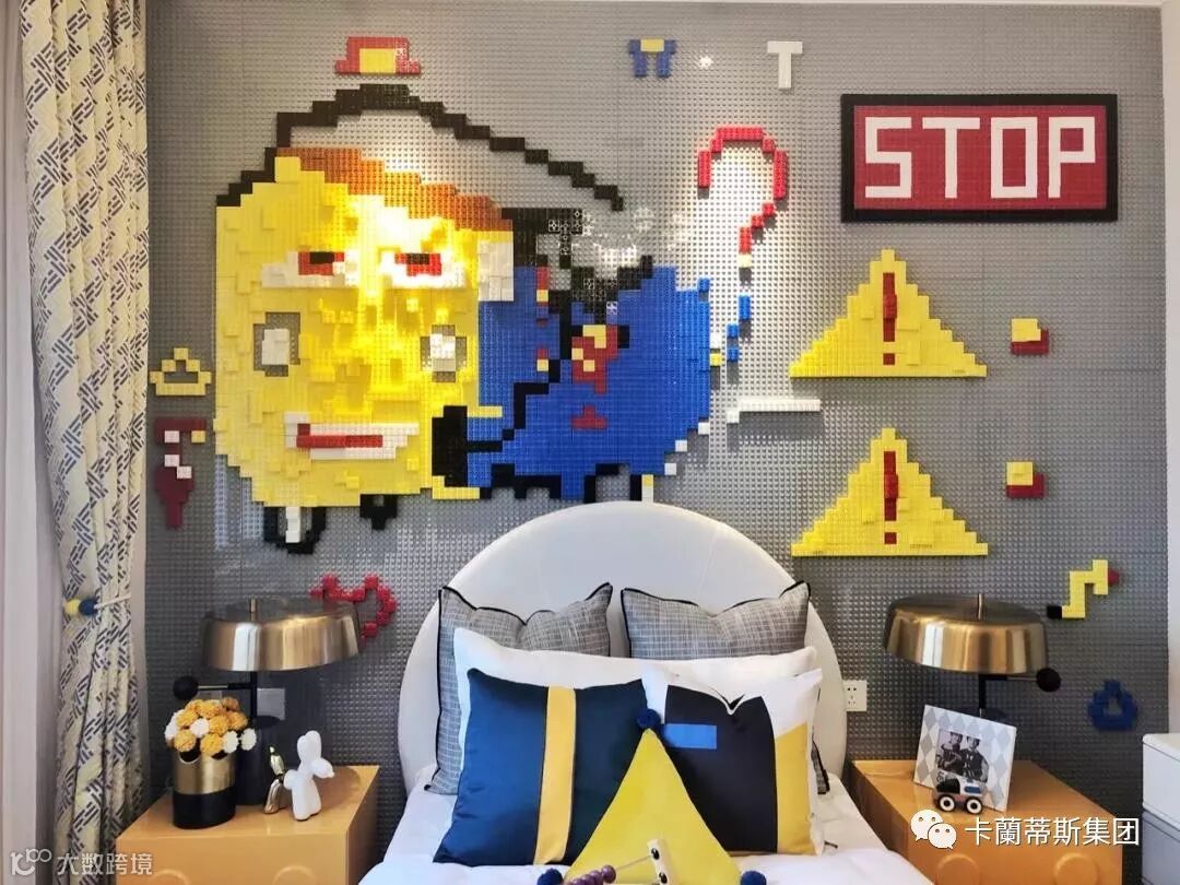 更值得一提的是,儿童房的背景墙是用乐高拼成的装饰画,不仅更有立体感,也符合孩子的童真、童趣。