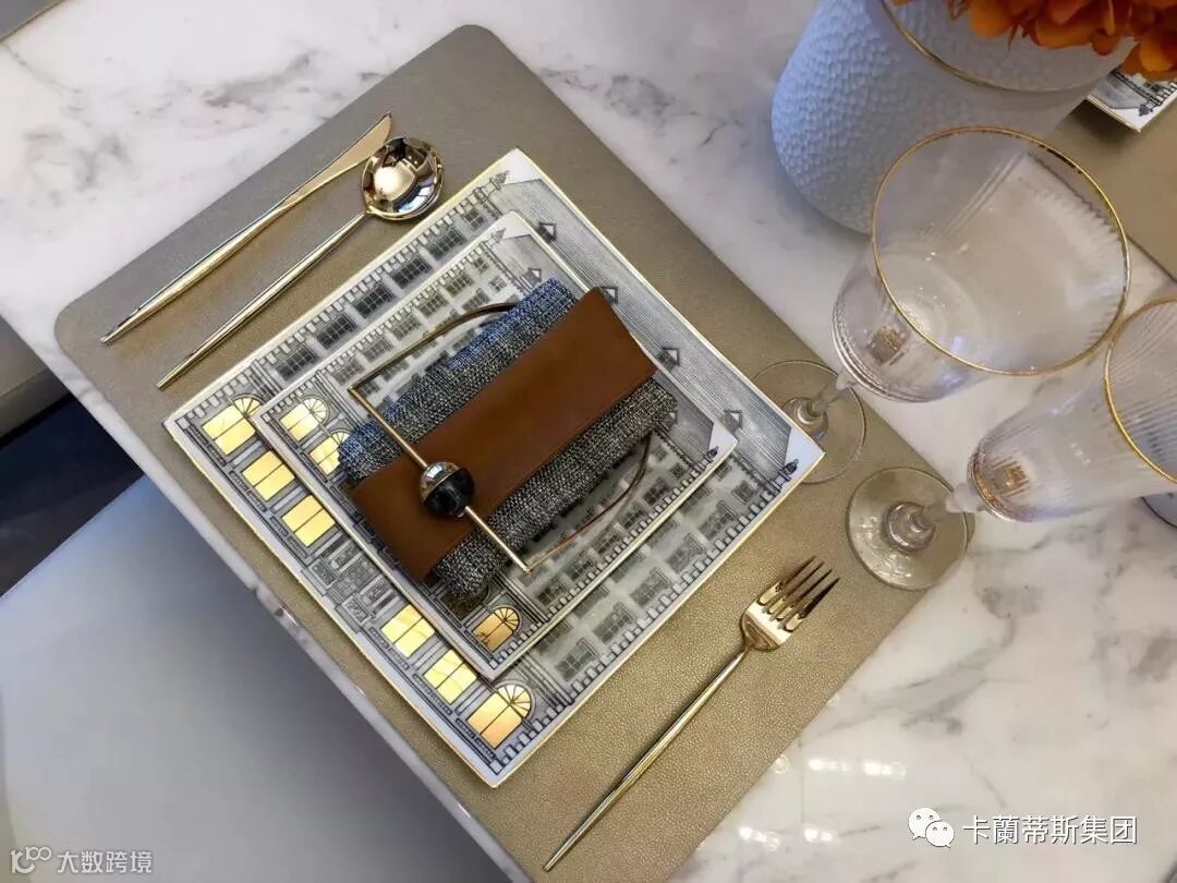 餐厅里的桌面是白色大理石、刀叉是黄铜色、高脚杯是带有金边。