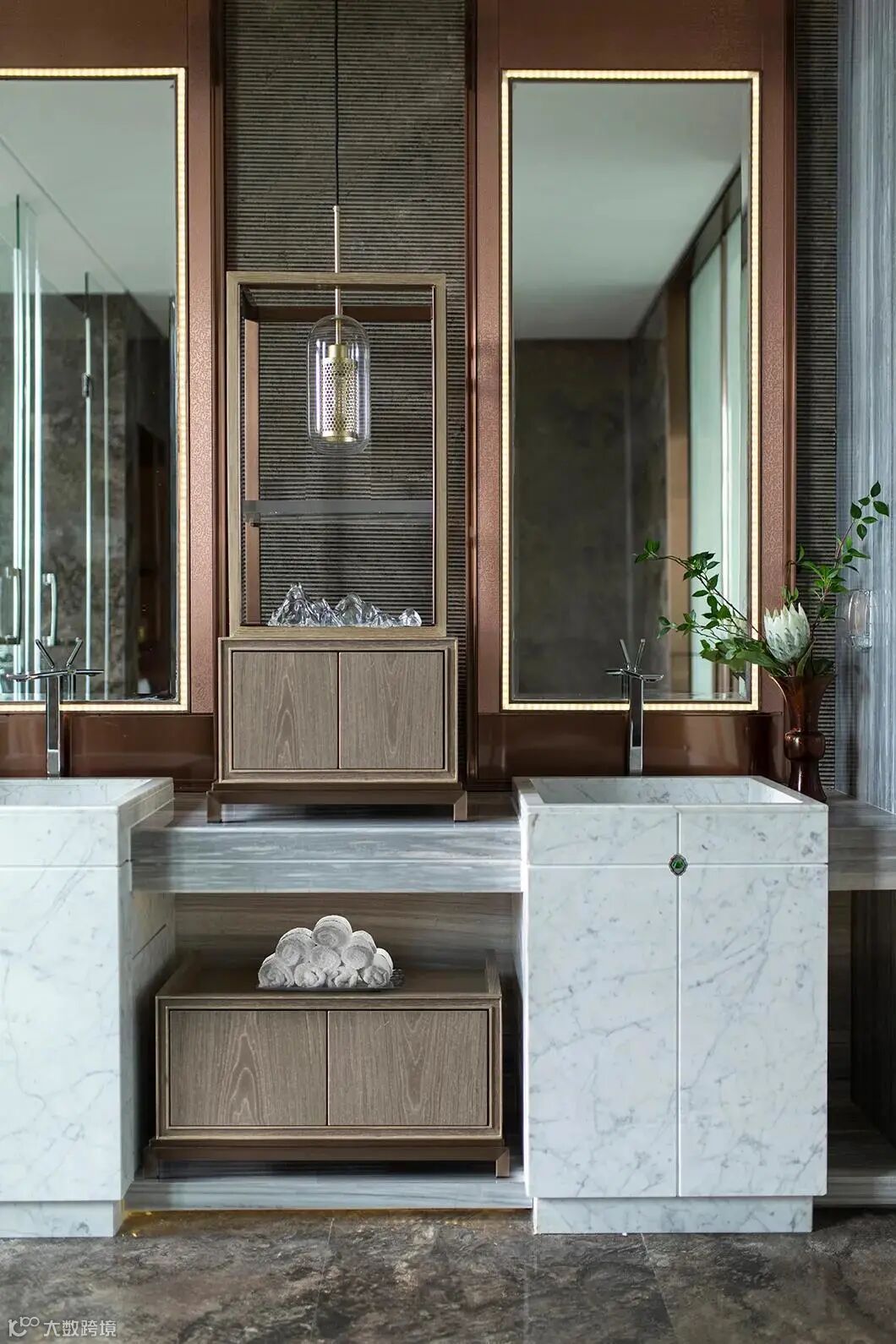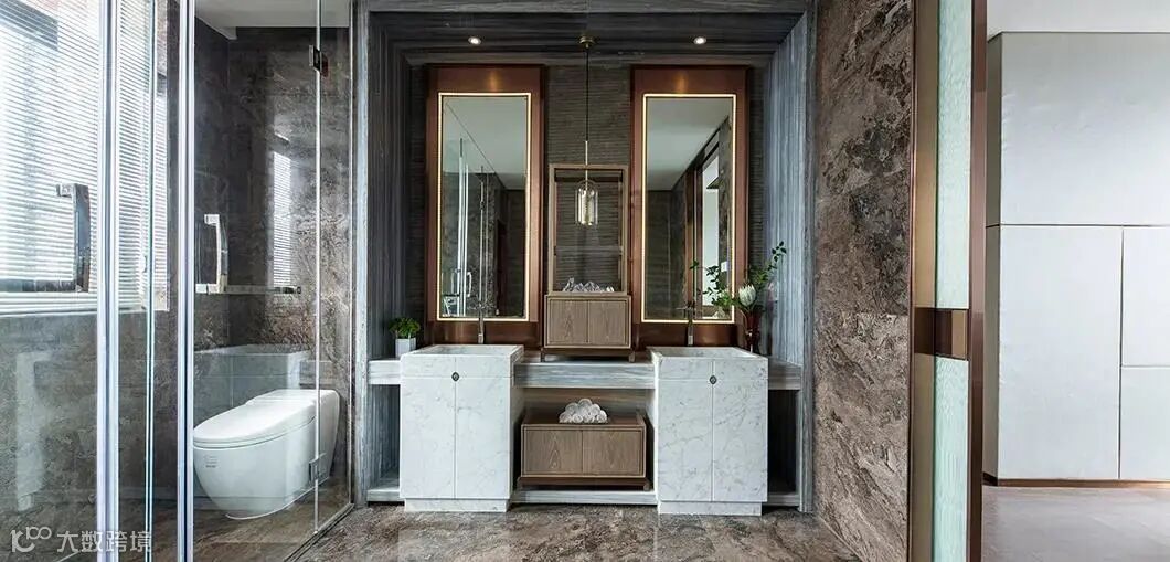 干湿分离的卫生间干净简洁,洗手盆的大理石纹路和旁边的几枝嫩枝,引入了自然恬淡的气息。