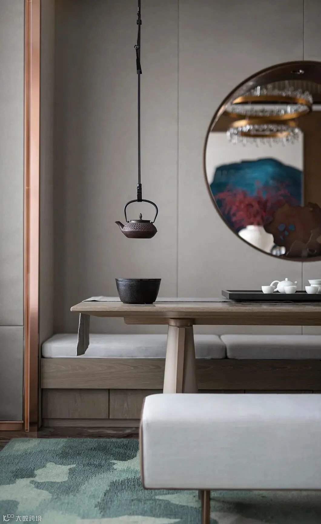 茶艺区中,圆形的山水画与茶具相映成趣。仿佛是在跟远方而来的客人轻声诉说:晚来天欲雪,能饮一杯无?