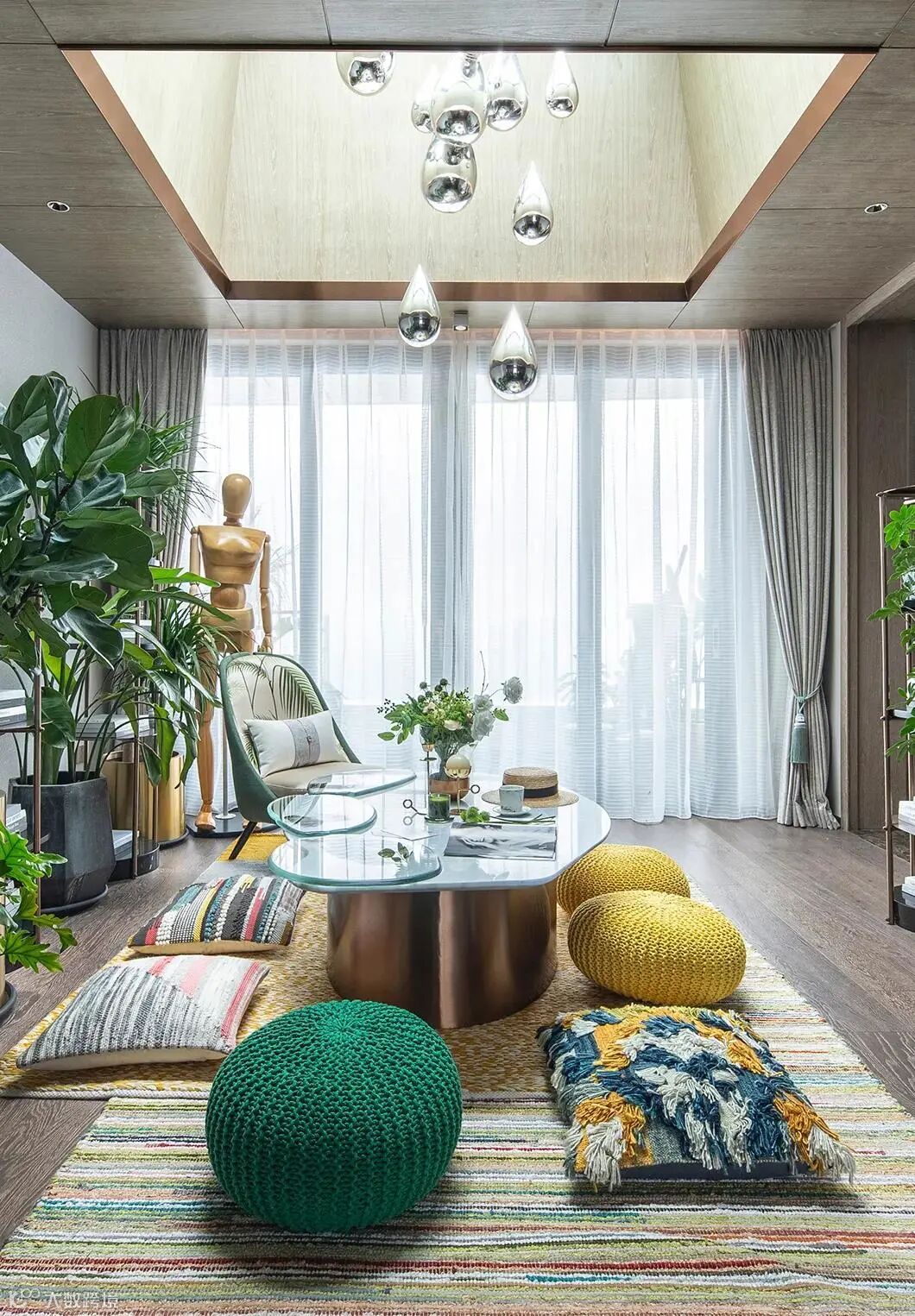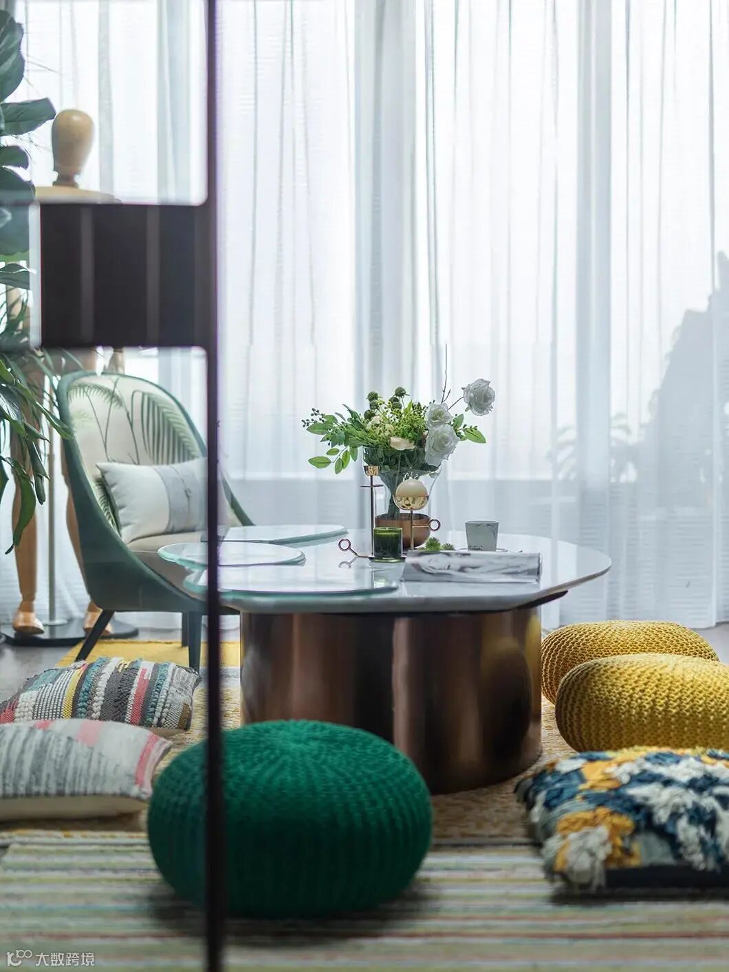 色彩斑斓的坐垫和新鲜的绿植,营造出生机盎然的氛围,这是家居设计中的点睛之笔,看似风格迥异,实则是静中有动,动中有静,相得益彰。