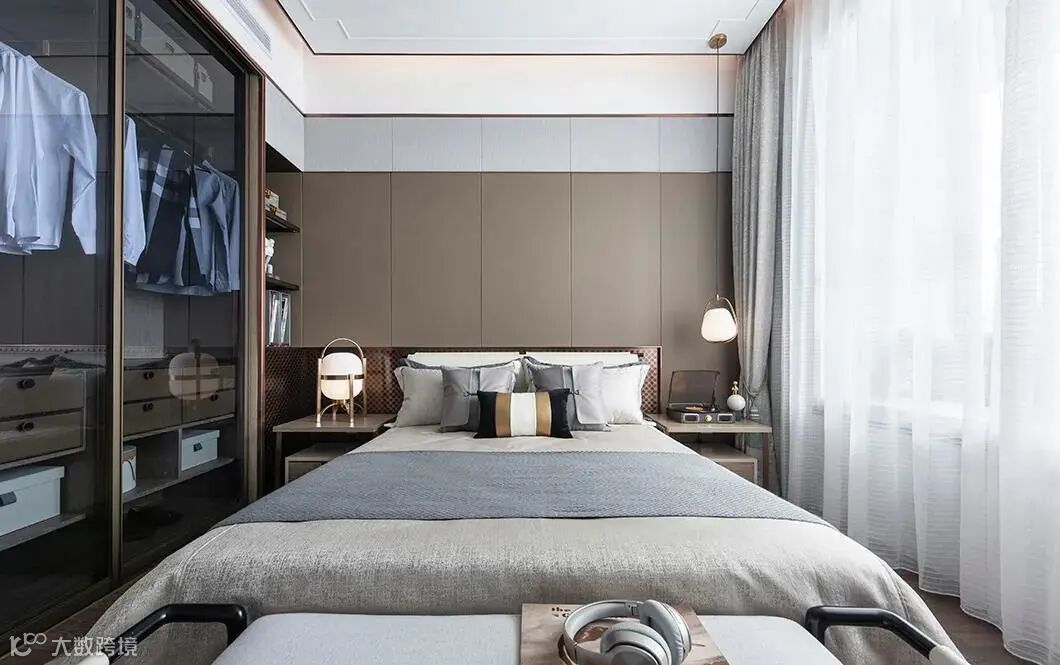 主卧宽阔,淡淡的山水墙更是从物理和心理层面上延展了空间,再搭配上精心挑选的床头灯,空间丰富而饱满。倚栏边,轻望碧空云舒云卷。