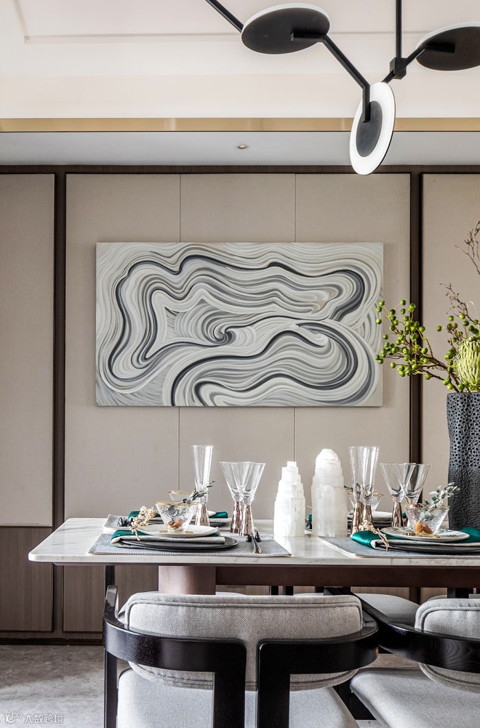 客餐厅空间衍脉自深厚邈远的传统文化,从家具的形制、流线、色泽,到挂画,均镌刻着东方诗性的肌理,流露出自信大方的悠悠风骨。