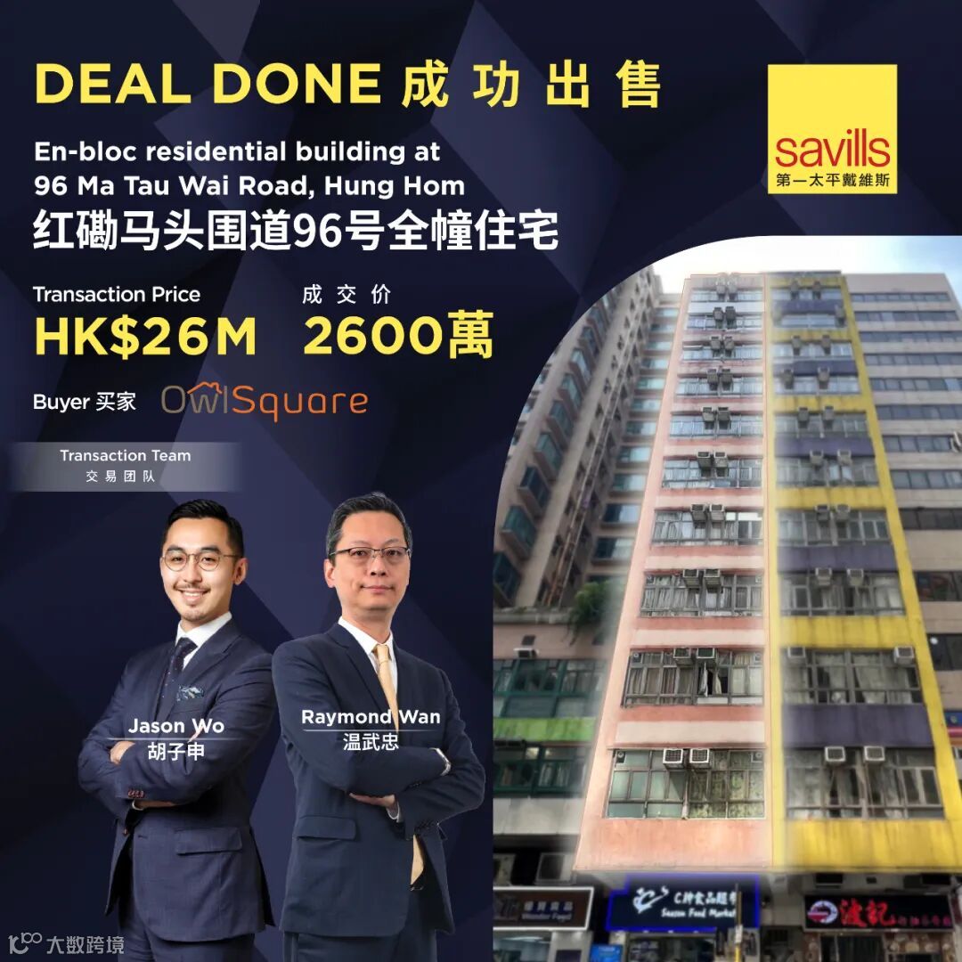 国际房地产顾问第一太平戴维斯成功促成红磡马头围道96号整栋住宅物交易。物业以现状连租约出售,作价港元2,600万,买家为潘解颐 Owl Square及相关人士。