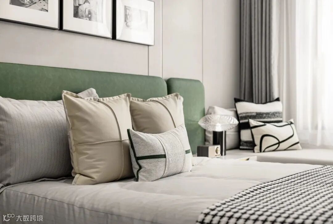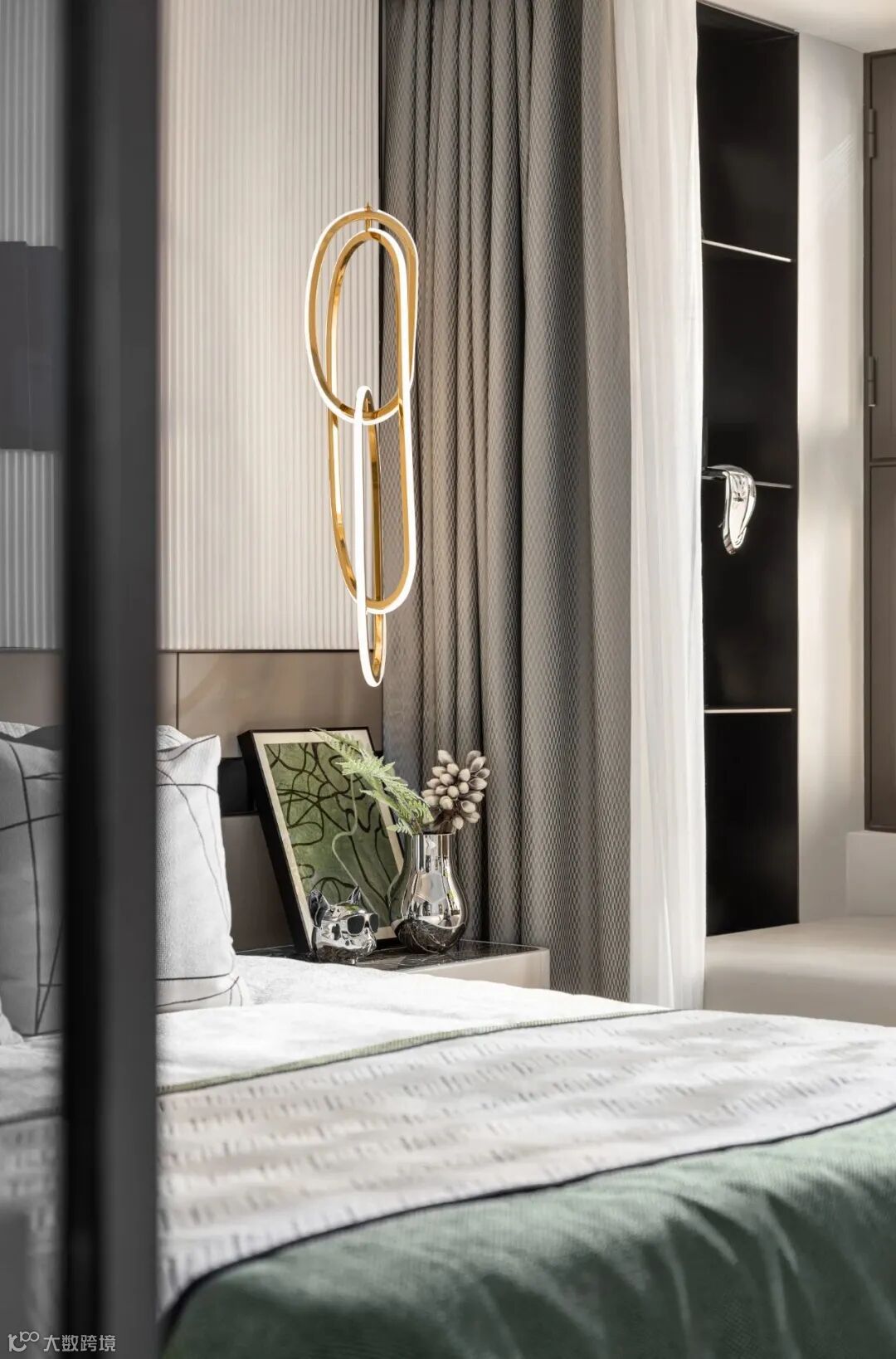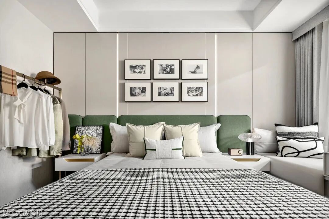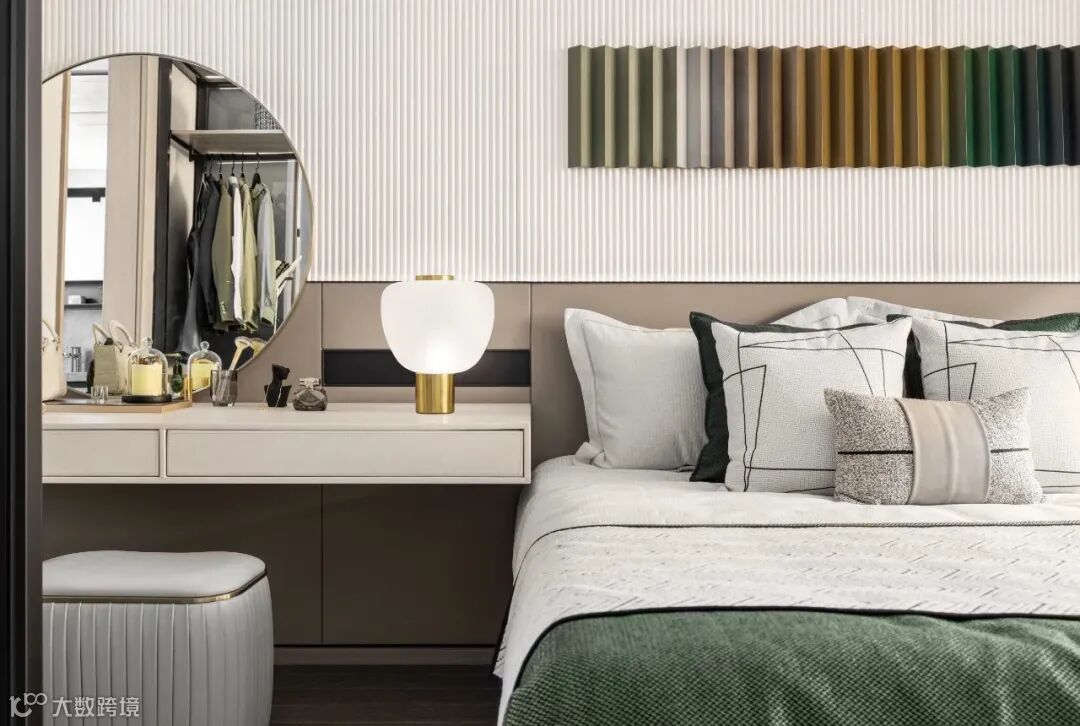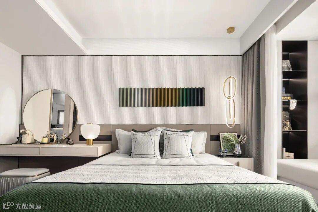 卧室氛围舒适怡人,让人充分感受更为年轻与现代的安静与生活方式诉求,在主卧空间中,床头渐变艺术装饰与背景墙纹理统一,层次分明。