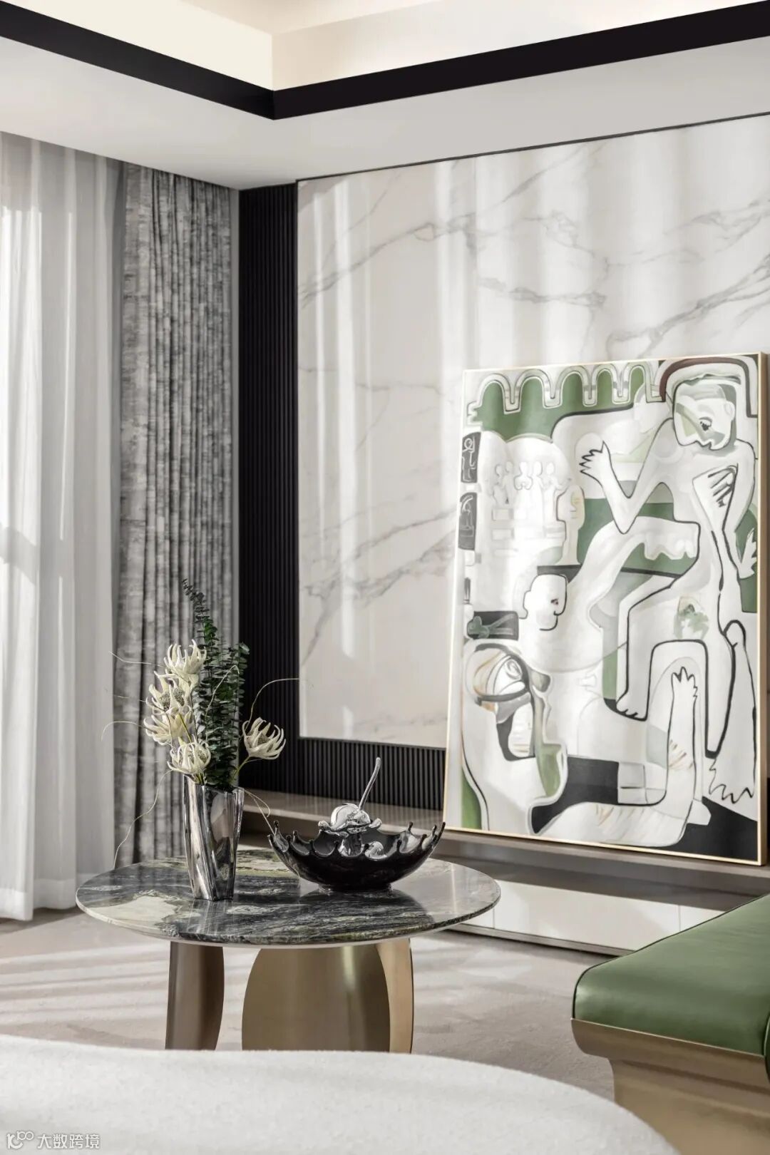 客厅空间通过黑白色搭配带有草木气息的松灰绿的明暗变化,以独到的美学见解、材质肌理间的明暗对比,使轻奢艺术元素得以被重新诠释。