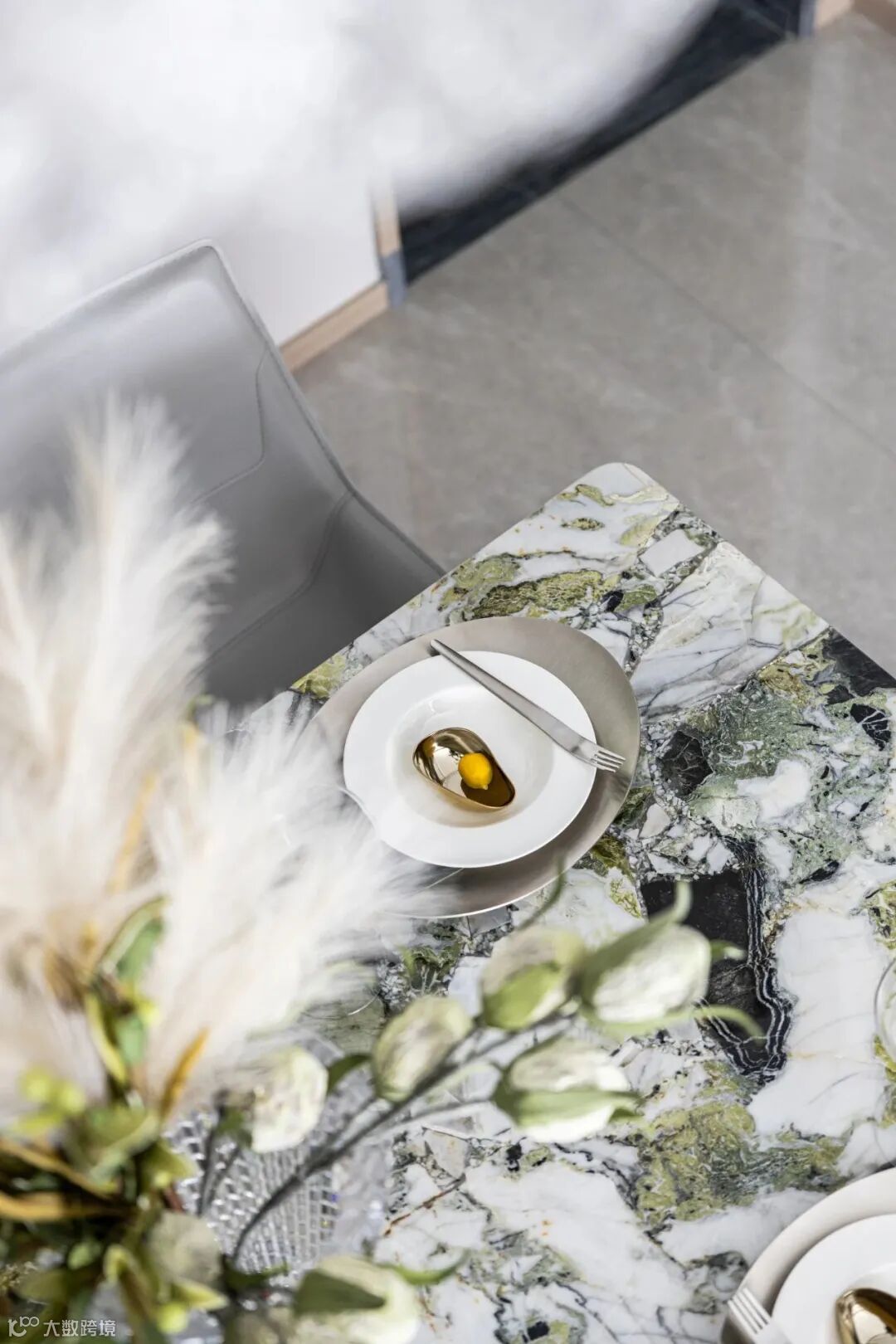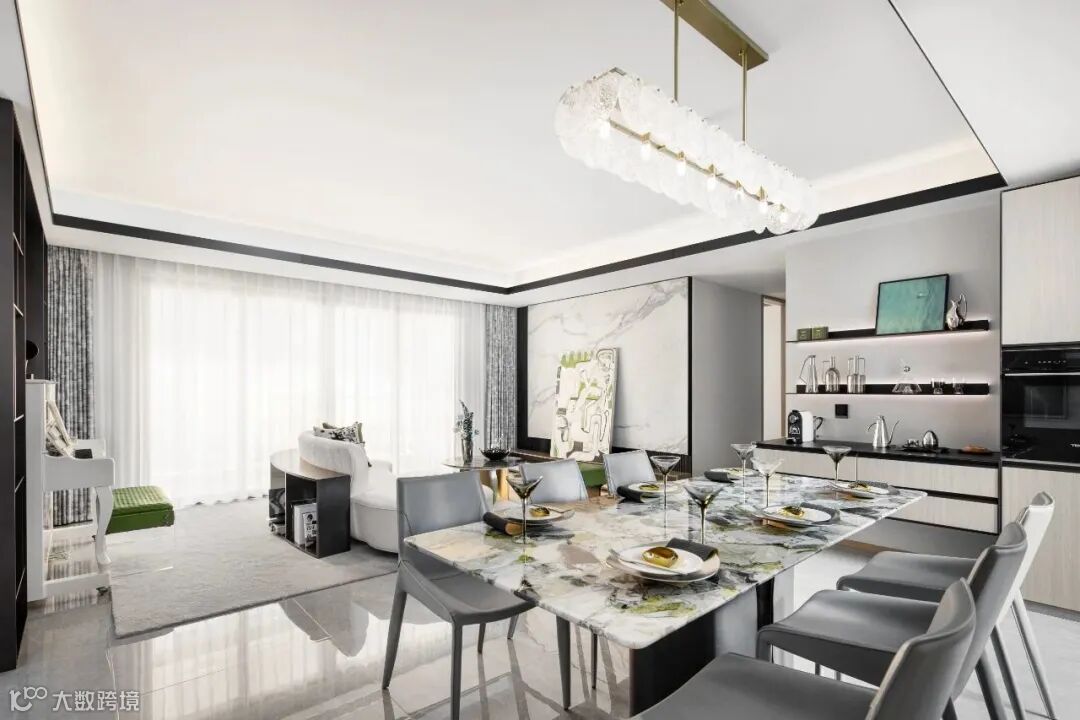 餐厅区域极具现代感的装饰挂画给人强烈的视觉冲击,放空思绪沉醉于此,大理石纹路与松灰绿相互交融。线条流畅的软装家具,既有岁月打磨后的艺术格调,又有现代都市赋予的精致奢华。