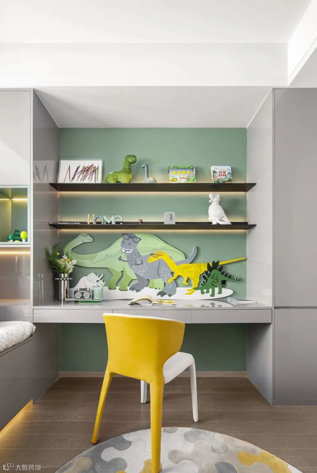 儿童房的设计,植物的融入让空间生机勃勃,绿意盎然。黄色点缀明亮活泼,恐龙的元素的融入引申出孩子的探索欲和创造力。