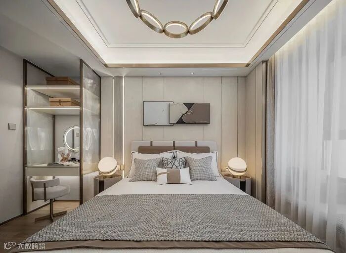 主卧落笔于都市生活的艺术情致,设计运用深浅清透的设色、经典雅致的软饰,令空间浸润着美学的层次、人文的温度、现代的简雅。