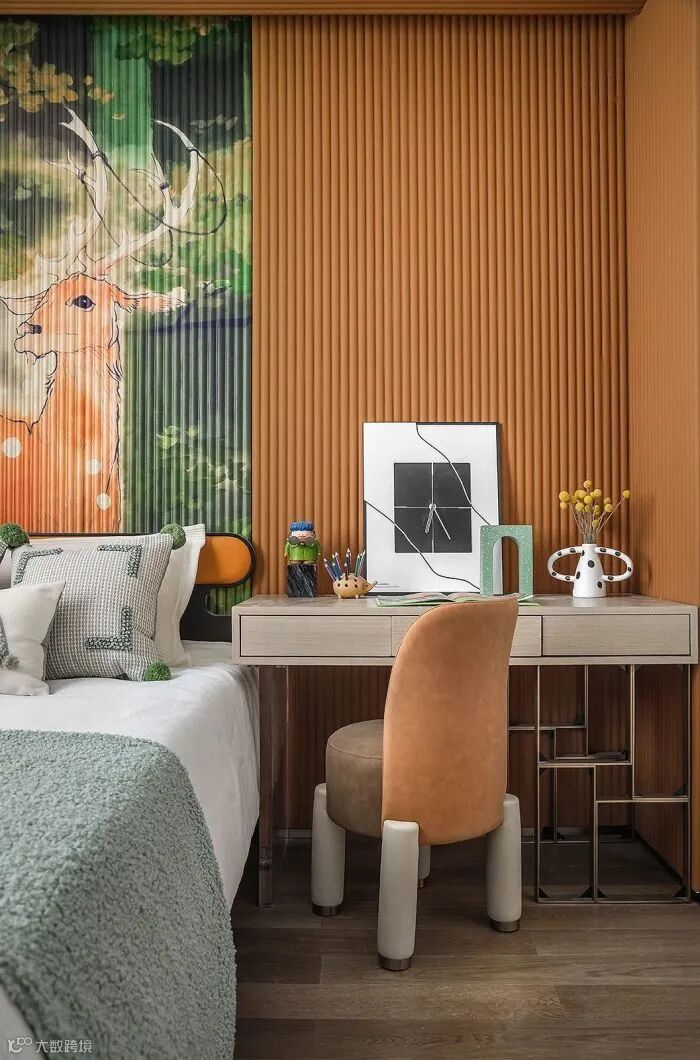 从孩童视角出发,设计以“绿野仙踪”为主题,将空间的设计亮点聚焦于生动的森林小鹿墙画,并运用浅豆绿、黄棕色的色调互补,将鲜活的语素注入空间中,展演空间丰盈的格调与趣味。