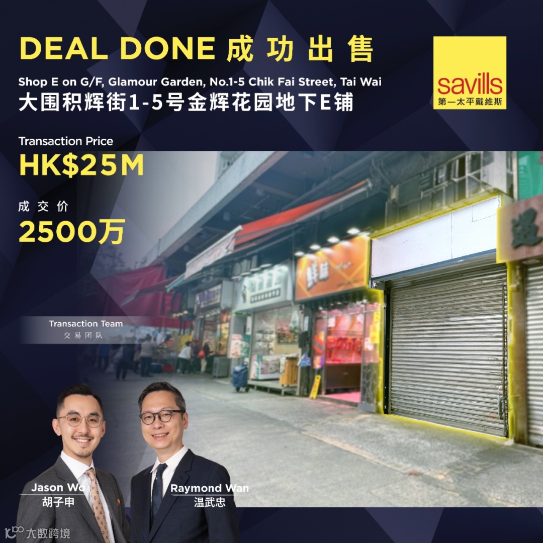 第一太平戴维斯投资部资深董事胡子申先生表示:「此次交易是继旺角千望项目后,再次成功售出的零售银主盘,反映市场对优质商铺物业的持续需求。该商铺先前的每月租金收入为14万港元,按成交价计算,租金回报率达6.72%,投资价值显著。大围区近年发展迅速,随着新住宅项目陆续入伙,区内消费力持续提升,带动商铺市场需求。」
