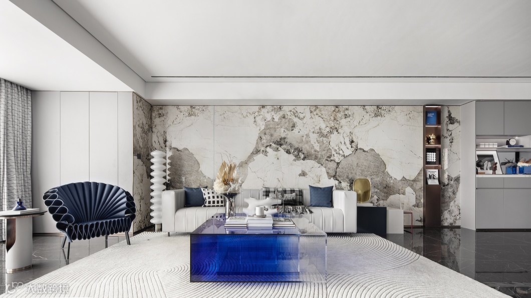 克莱因蓝玻璃茶几线条凌厉、极具艺术感,无疑成为客厅的点睛之笔。大理石的天然纹理如水墨画般,气势恢宏地在墙面上肆意泼洒,成为客厅独特的风景。