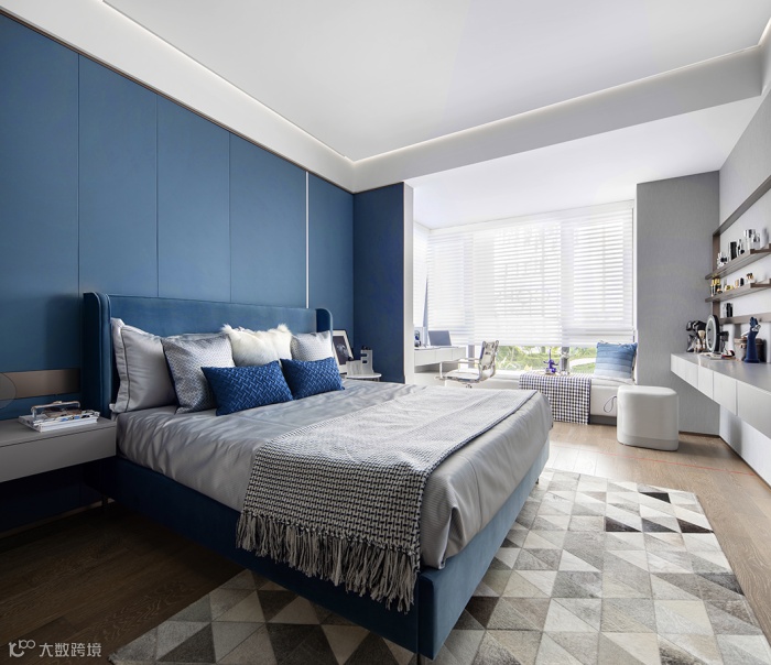 深蓝在背景墙上大肆铺染,沉稳静谧的色调令人心生平静。大地色系拼接地毯与地板相互映衬,木材温润、布艺柔软。