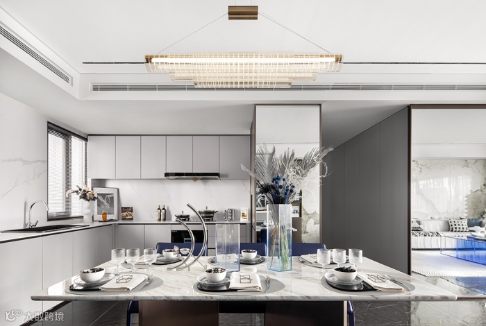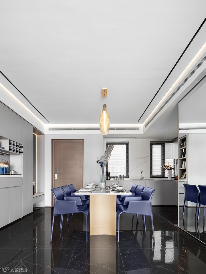 开放式厨房采用L型布局,以黑白灰作为主色调,打造时髦的现代餐厨空间。大理石与金属在经典蓝的映衬下更加凸显质感,顶部灯光与底部黄铜遥相呼应,为空间注入几分暖意。