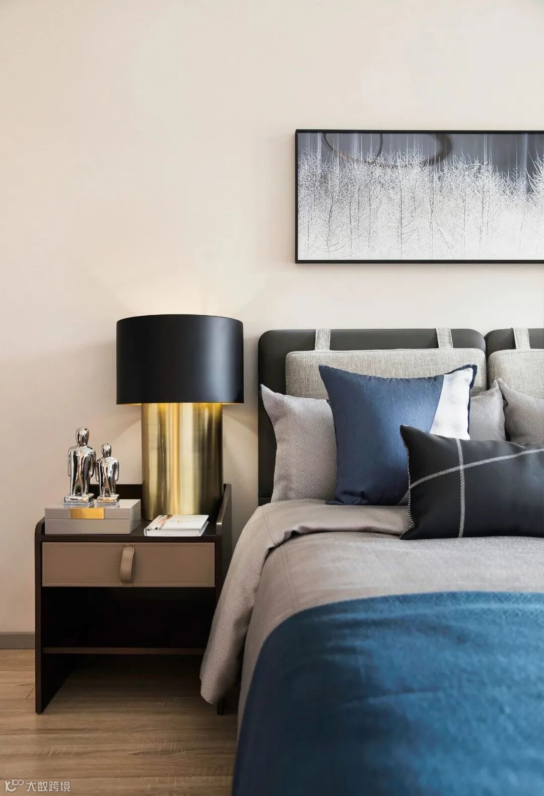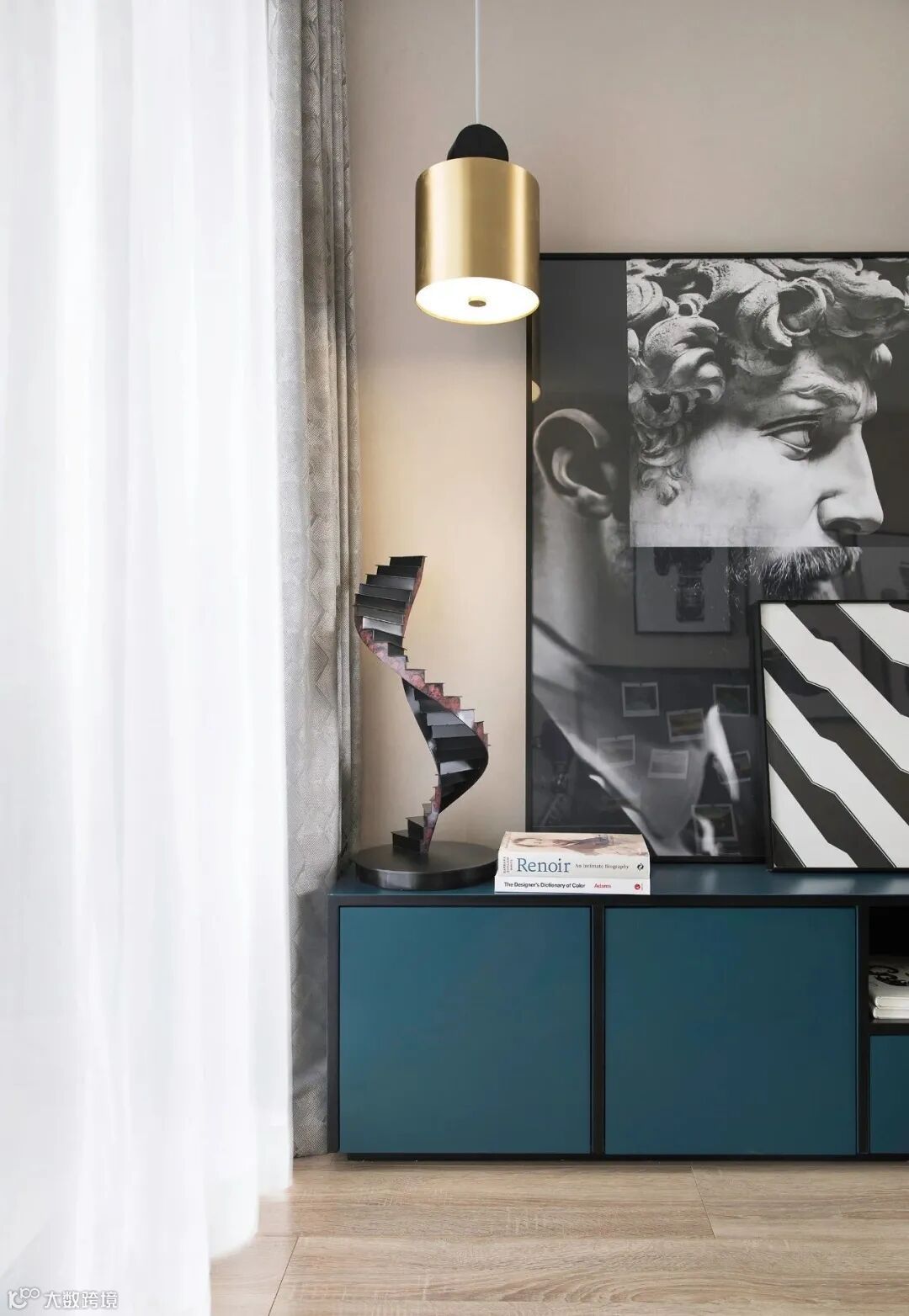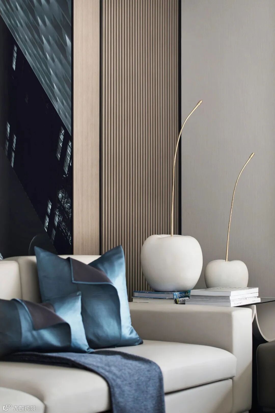 不同层次的灰蓝色系,与简洁雅隽的线条形制配衬,零落点缀于各处的趣致工艺小品,为空间搭建起精睿高尚的当代艺术视像,为生活赋予崭新的定调。