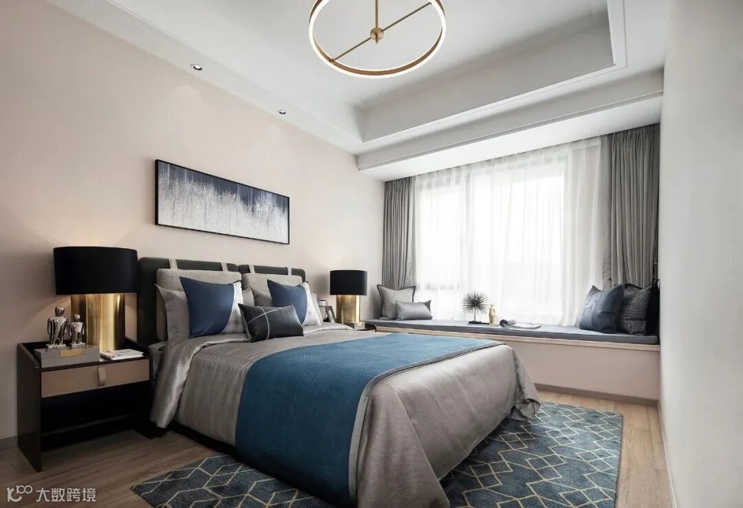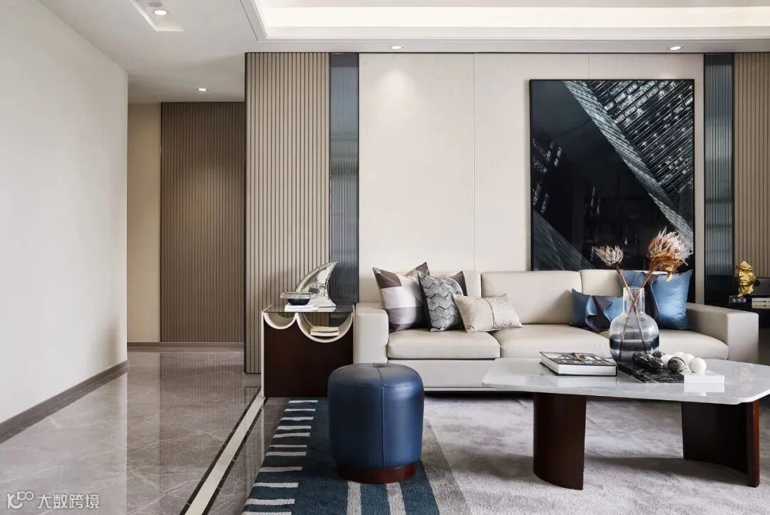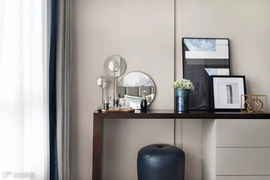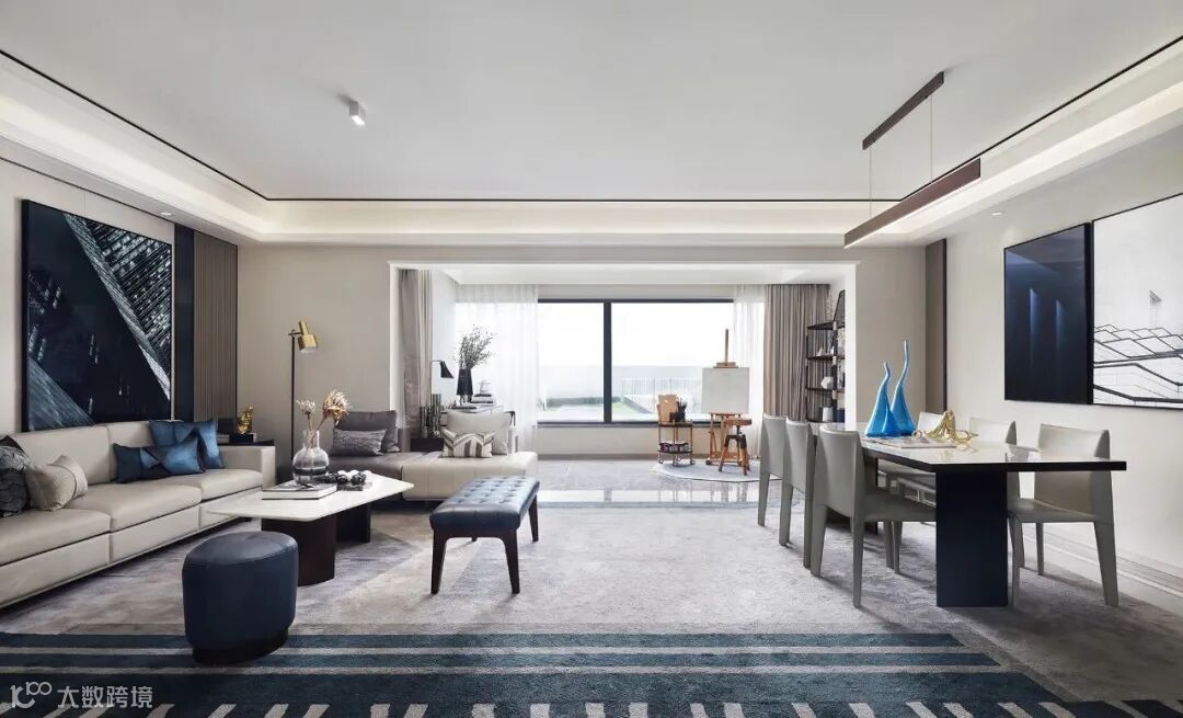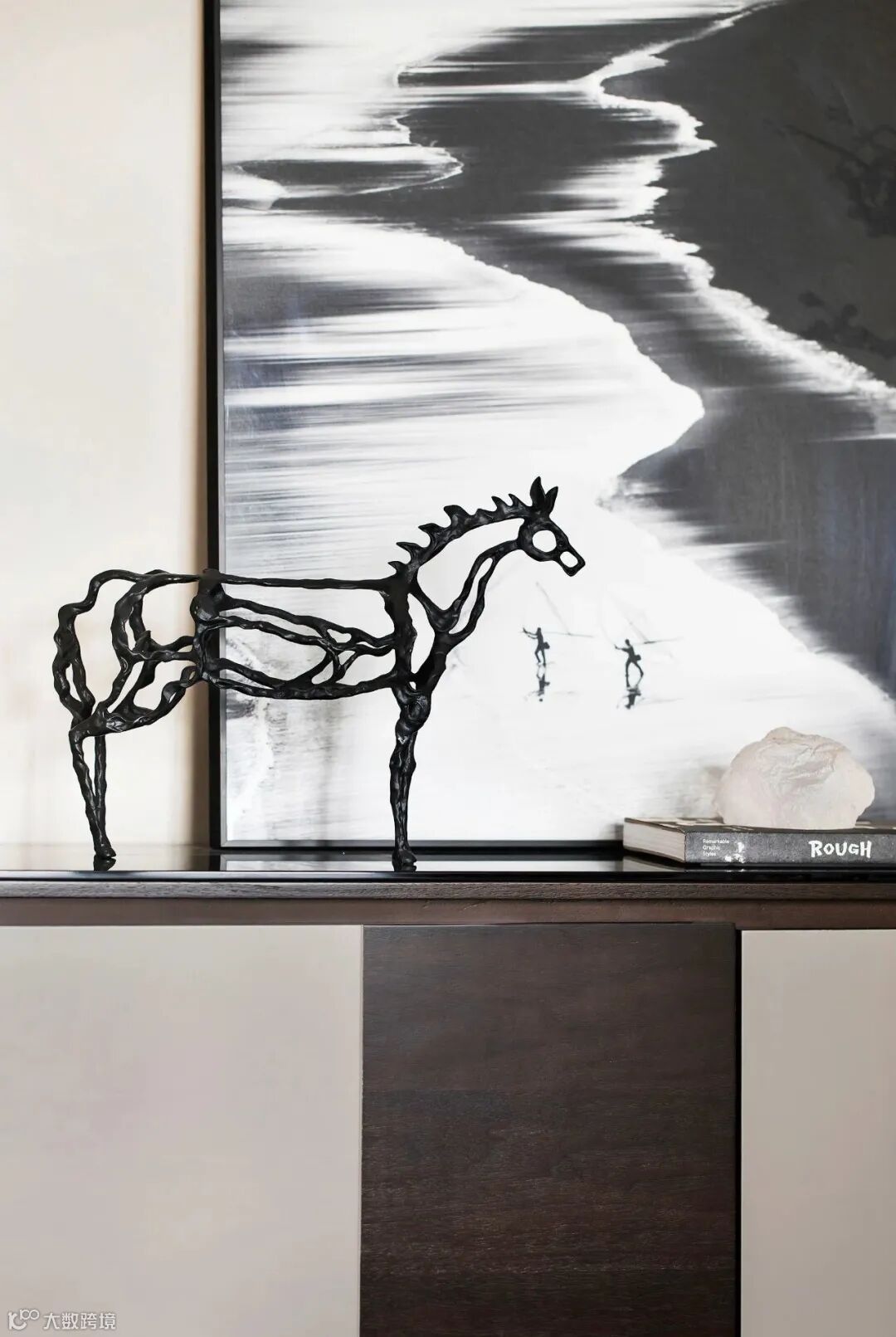 不同层次的灰蓝色系,与简洁雅隽的线条形制配衬,零落点缀于各处的趣致工艺小品,为空间搭建起精睿高尚的当代艺术视像,为生活赋予崭新的定调。