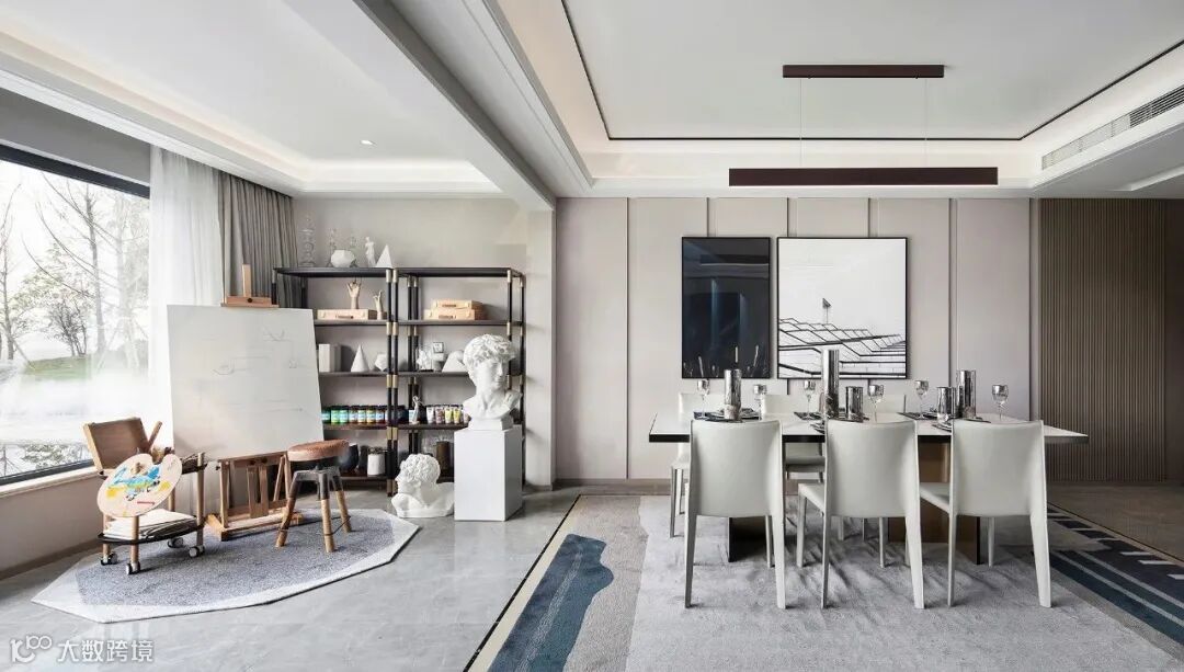现代风格沙发围合出会客区,而纯白的餐桌椅构设一隅高雅就餐区,借生趣的挂画以及摩登的杯樽餐具装点,别有一番雅趣。