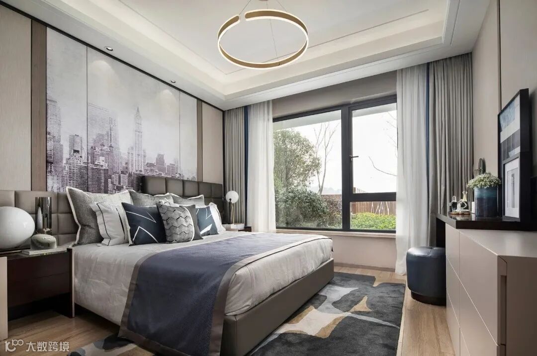 私人空间的设计,讲求私密性和舒适感,主卧不仅空间尺度舒怡,以高低不同的软包打造,加之趣味多元的几何线条与色块装饰,令空间在一片低饱和度中亦饱有跳脱而轻快的节奏感。