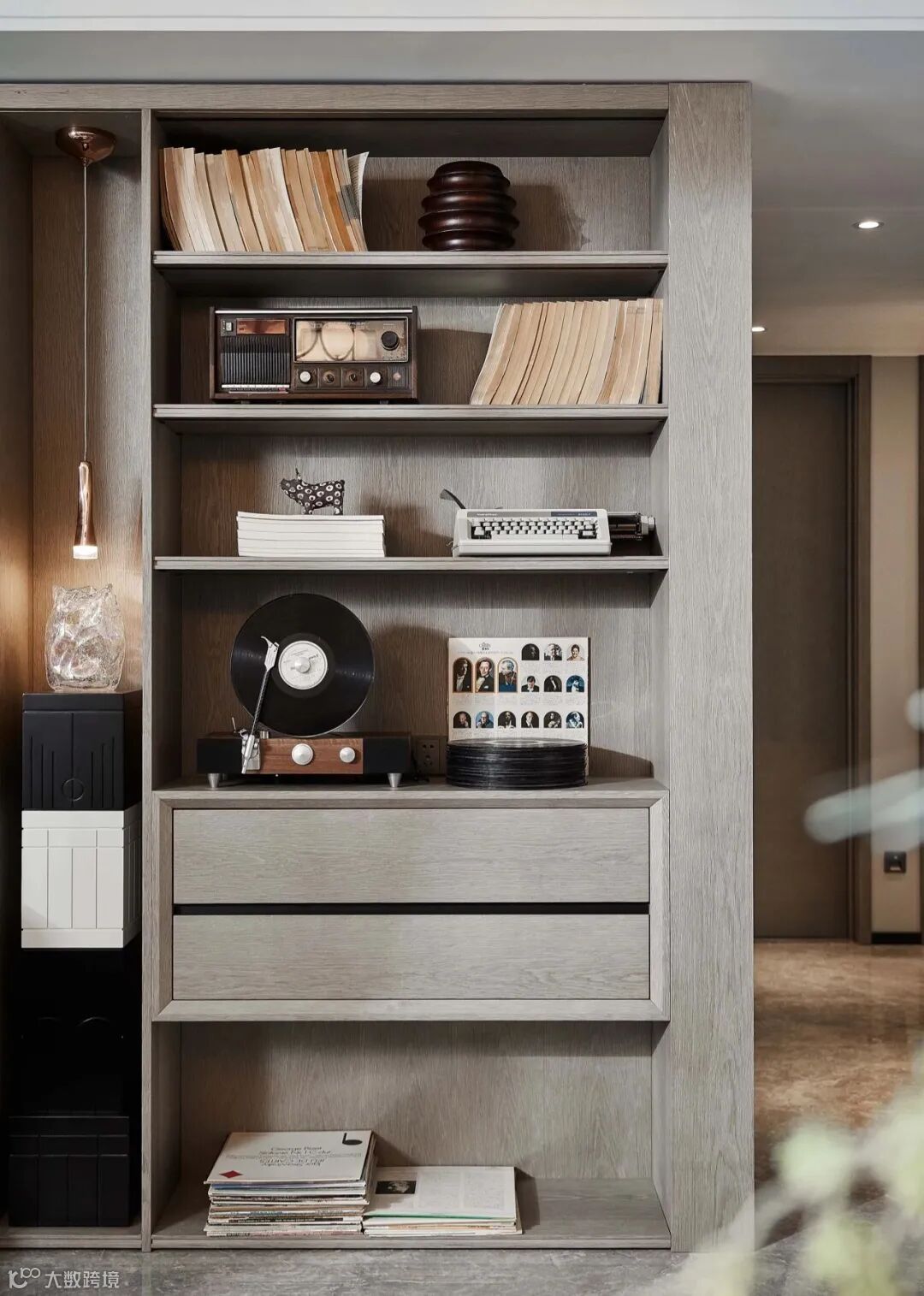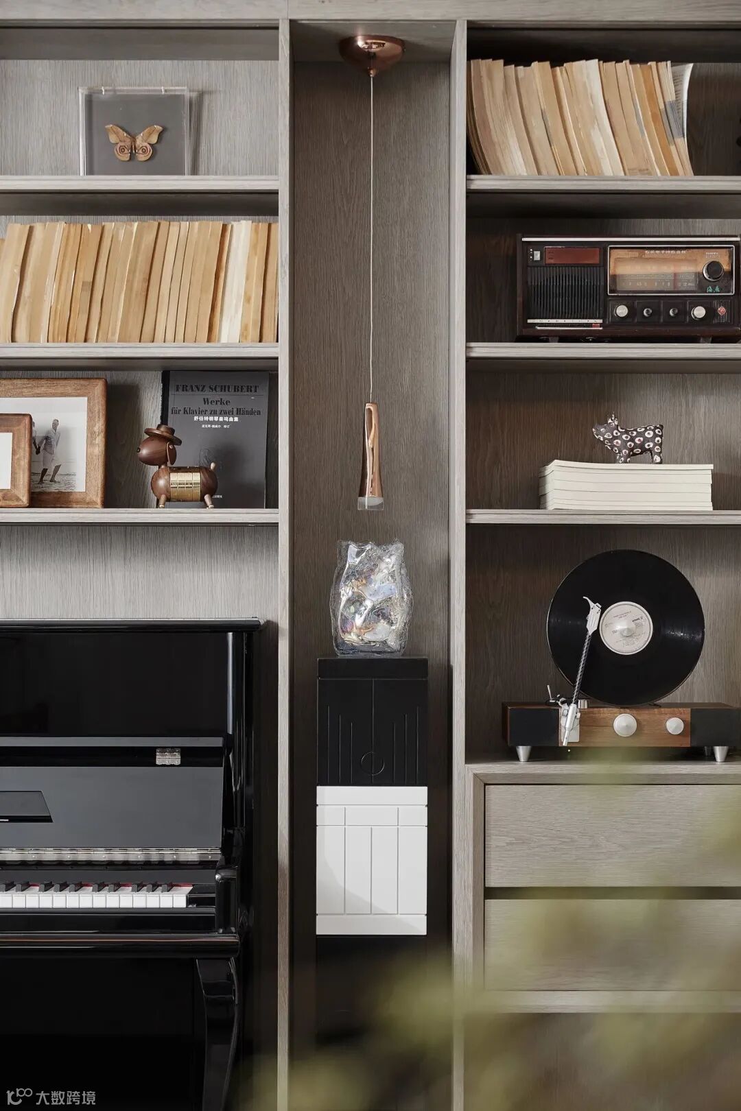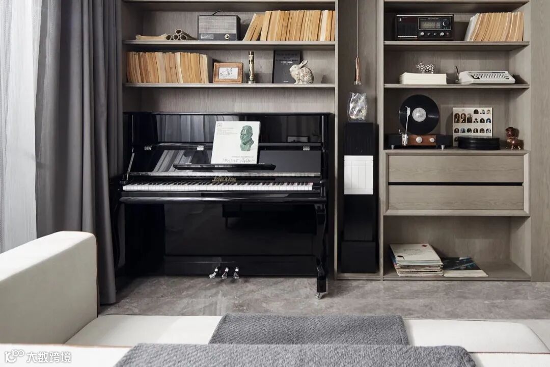 ▍ 钢琴旁的书柜上摆放着老式播放器