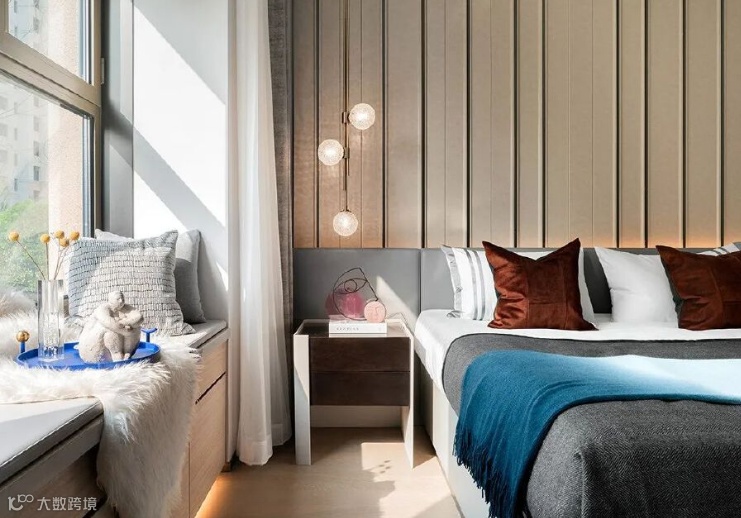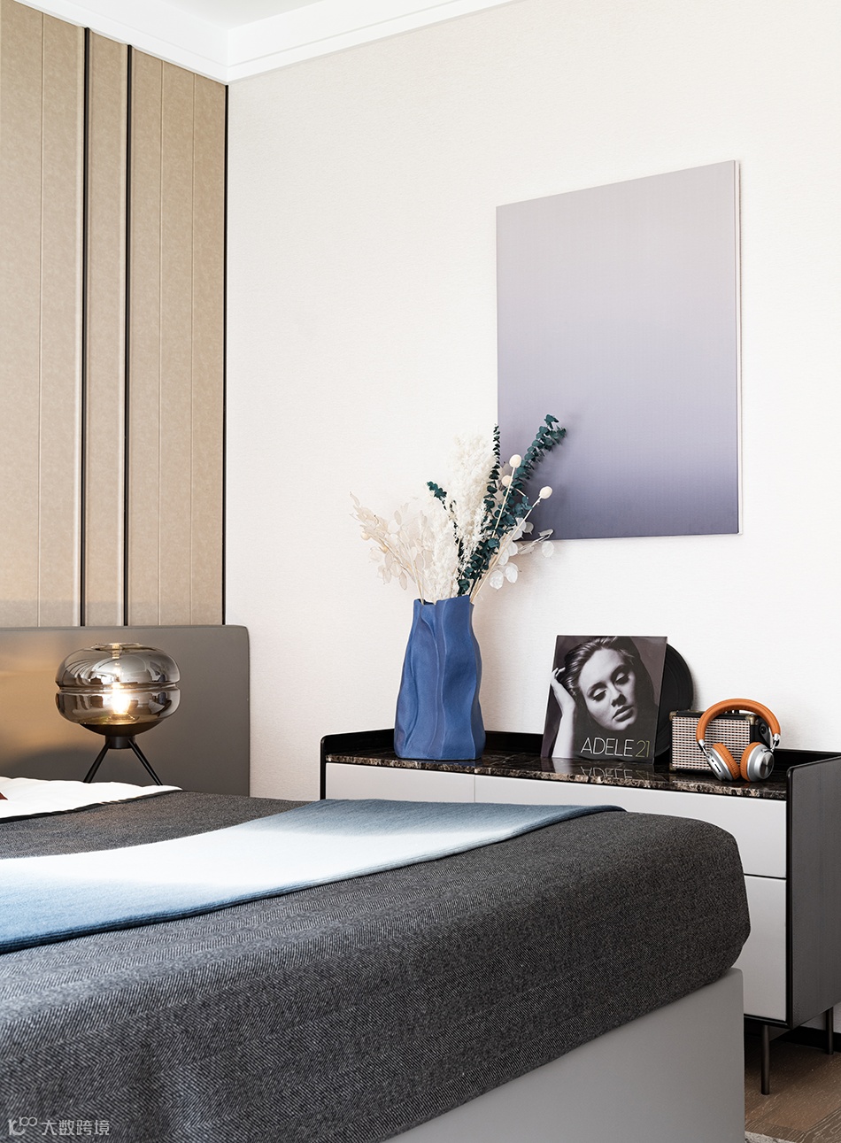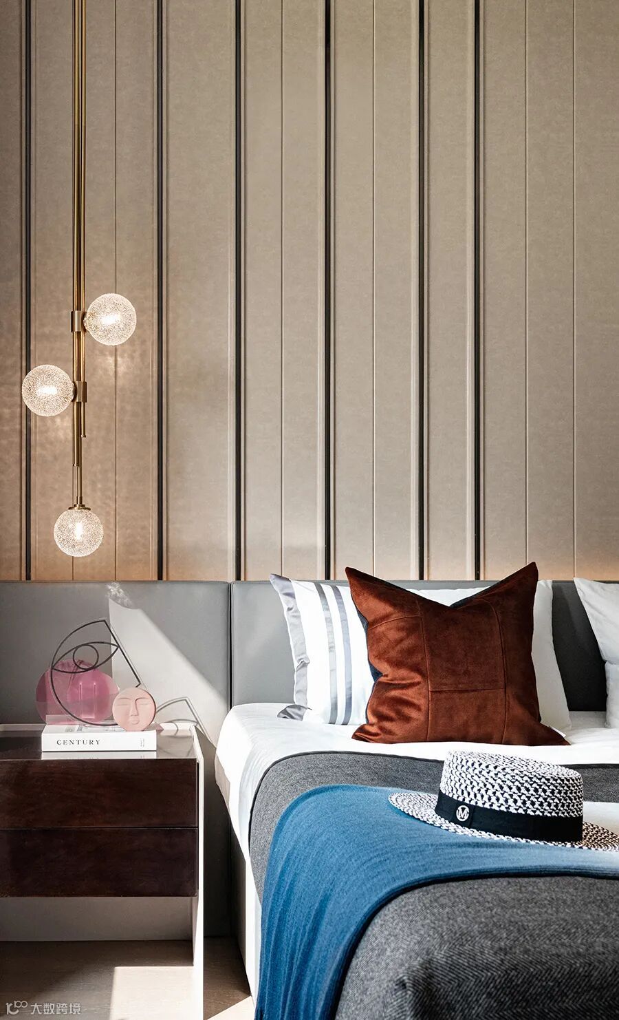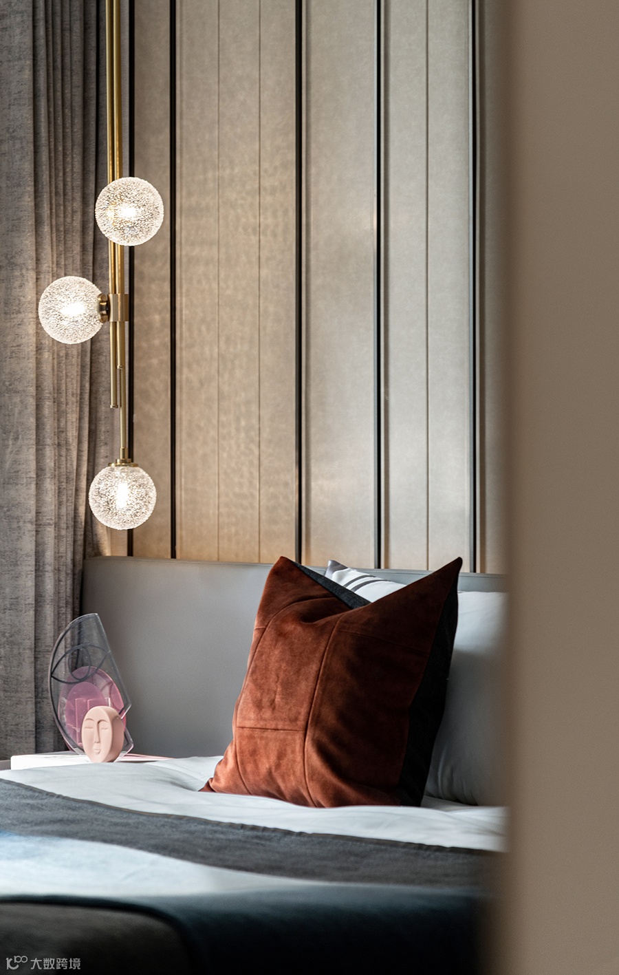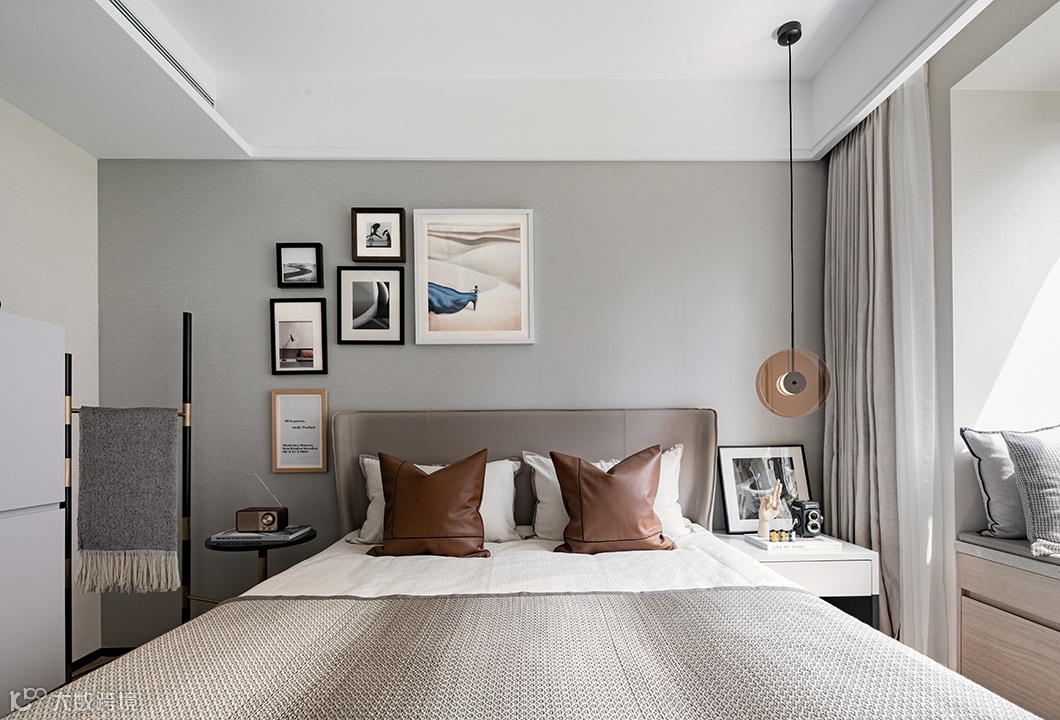 床头组合的摄影照片,成为空间主人爱好的聚焦点。砂砾色的皮质抱枕,使得空间更具品质感。