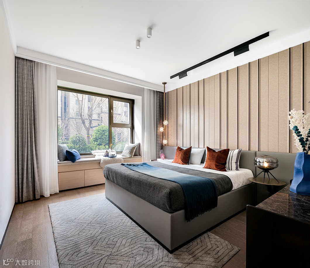 主卧通长的床头设计,结合硬装整体的木质背景墙,使得空间温润且有气质。