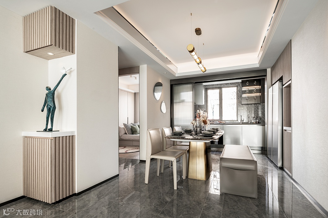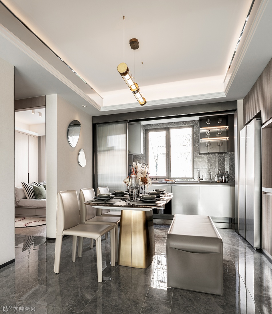 餐椅一侧选用长凳的形式,给居者带来更好的空间感受。生活的烟火气在厨房弥漫开来,在一餐一食中尽享都市里的生活与艺术。