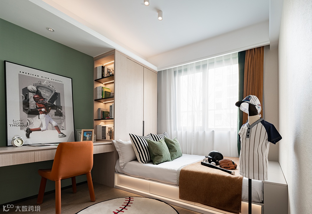 每个小朋友都有一个梦想,设计师将棒球运动的愿望实现在了属于他自己的空间里。以绿色及橙色系为主,利用棒球的元素定格儿童挥舞棒球棍打棒球的场景,释放出一方儿童的徜徉天地,让梦想一点一点靠近...