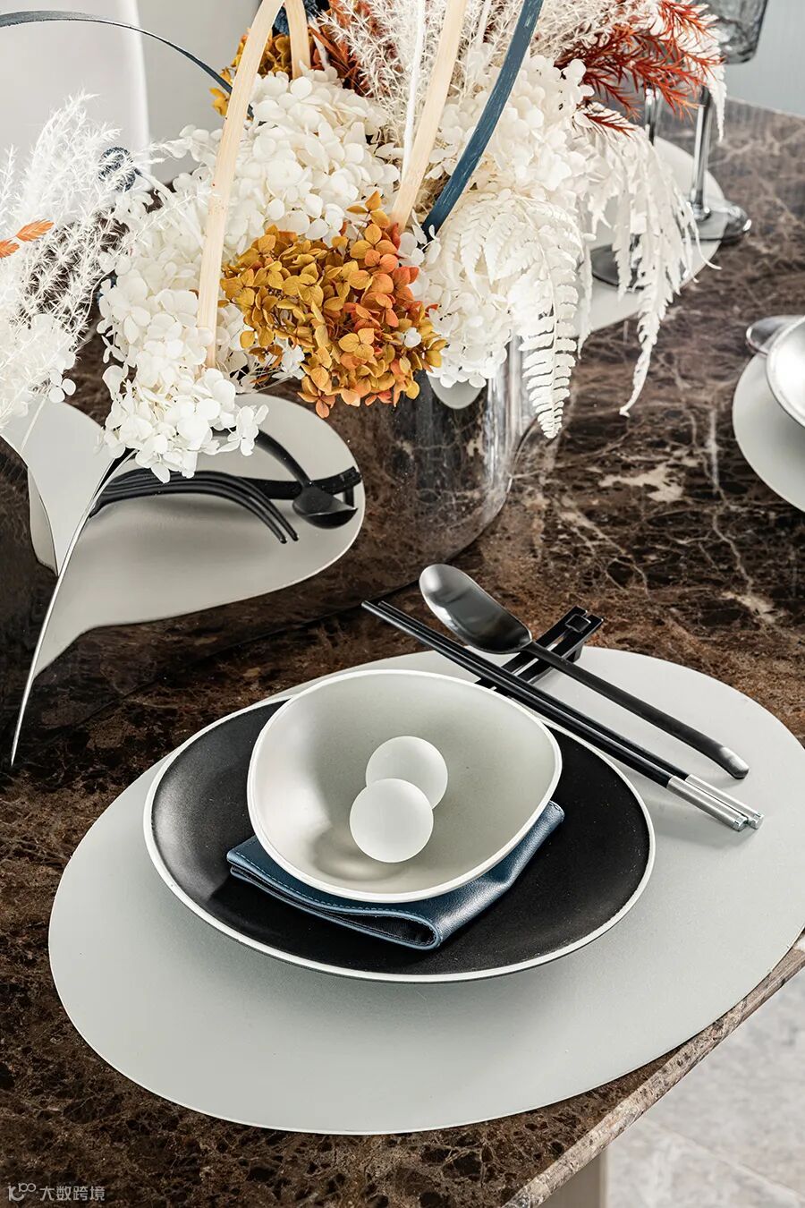 整体餐桌台面,选用进口深啡网,简洁大气,搭配品质感餐具,打造一家人进餐的惬意之地。
