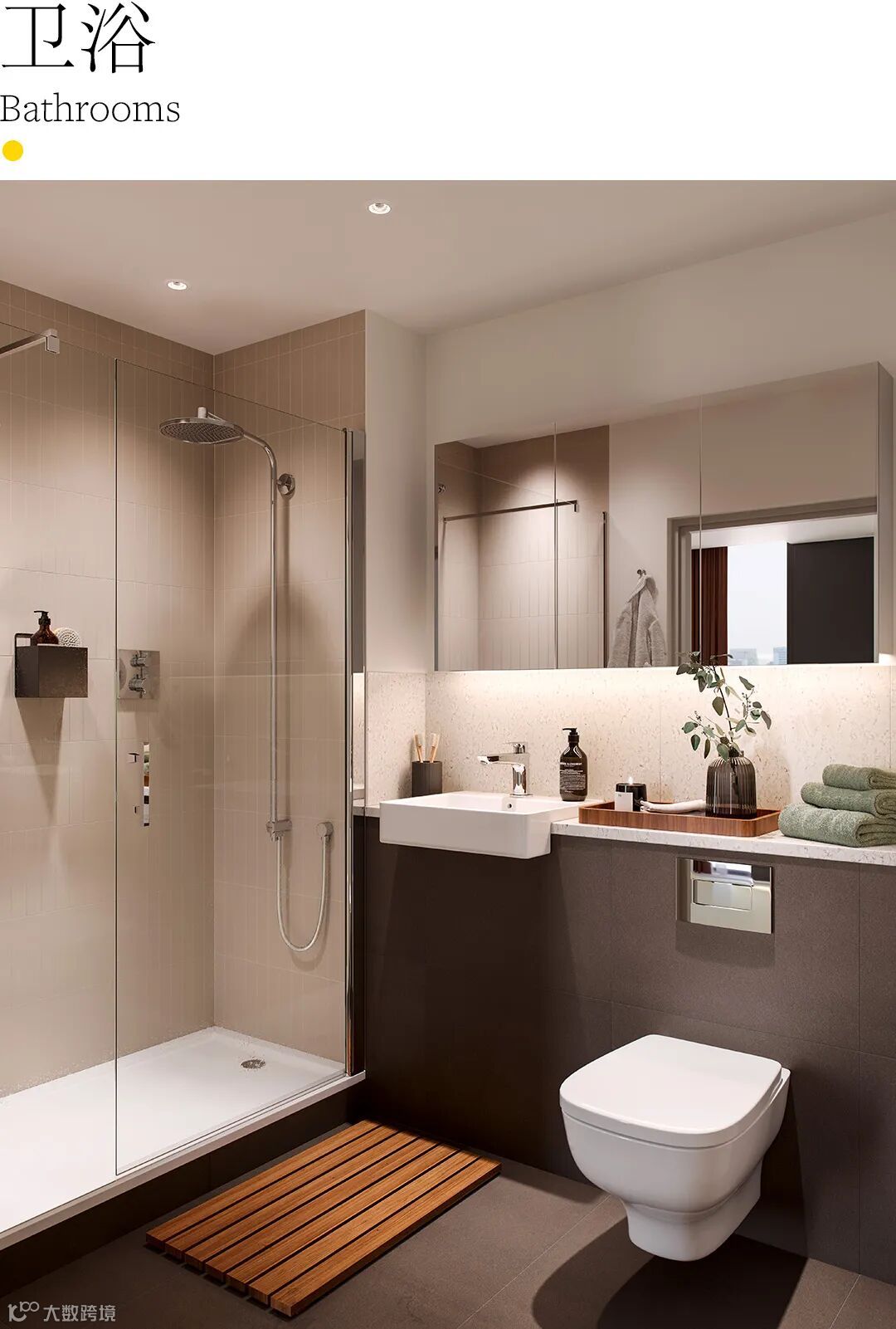 开放式厨房和卫浴均配置到位,其中厨房采用全套德国Bosch或同级别品牌家电、LED照明等,并有明暗两套配色方案可选(请在预定时向销售代表具体咨询),卫浴则设计了镜面橱柜、瓷质地砖等细节,关怀入微。