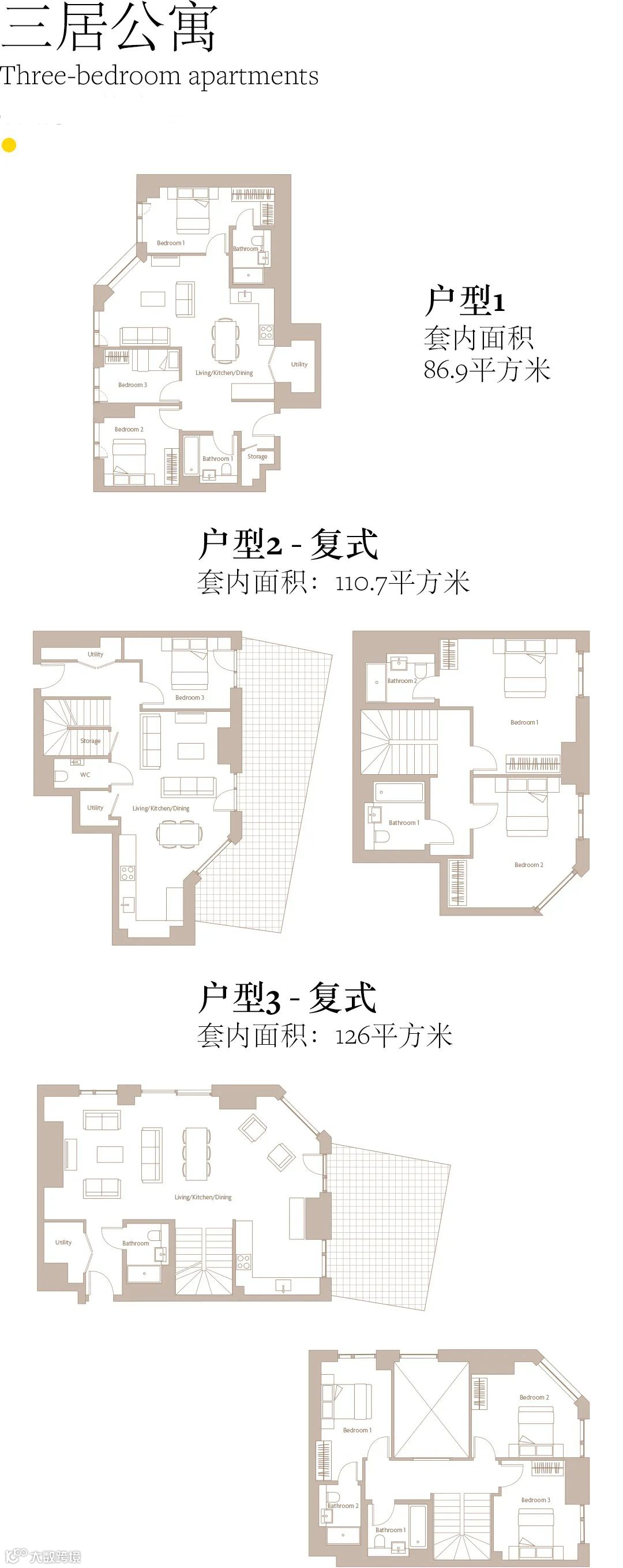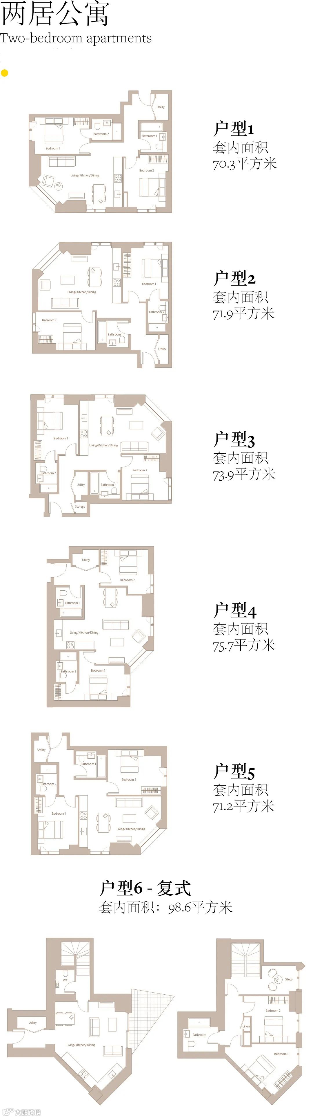 Crown View现有一至三居公寓在售,其中二居及三居公寓有复式户型可选,预计2025年第一季度起完工交付。